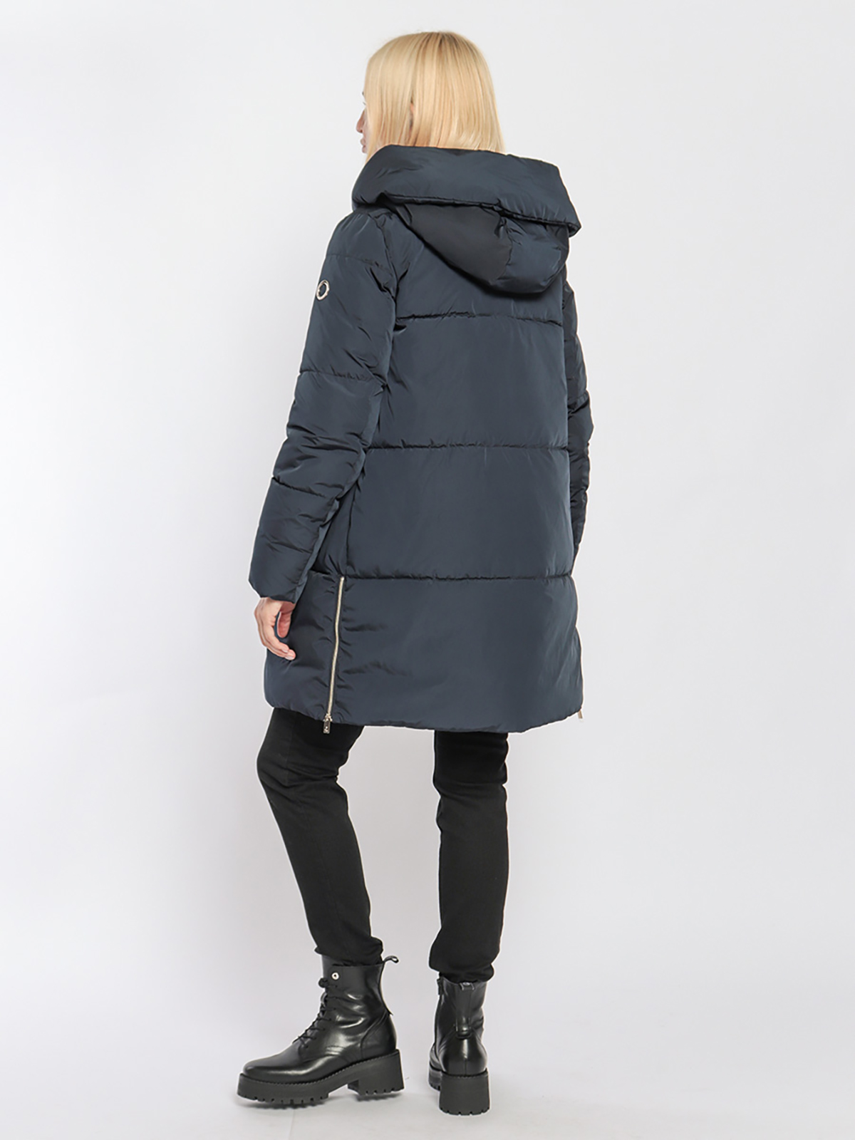 Темно-синее пальто с синтепоновым наполнителем – универсальная модель, хорошо сочетается с различными нарядами. Объемный капюшон, застежка на двойную молнию. Два боковых кармана с листочкой.