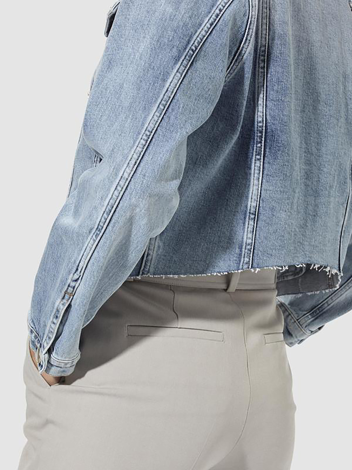 Укороченная джинсоая куртка с необработанным краем. Отложной рубашечный воротник, втачной рукав полной длины. Накладные карманы на груди, застежка на пуговицы.