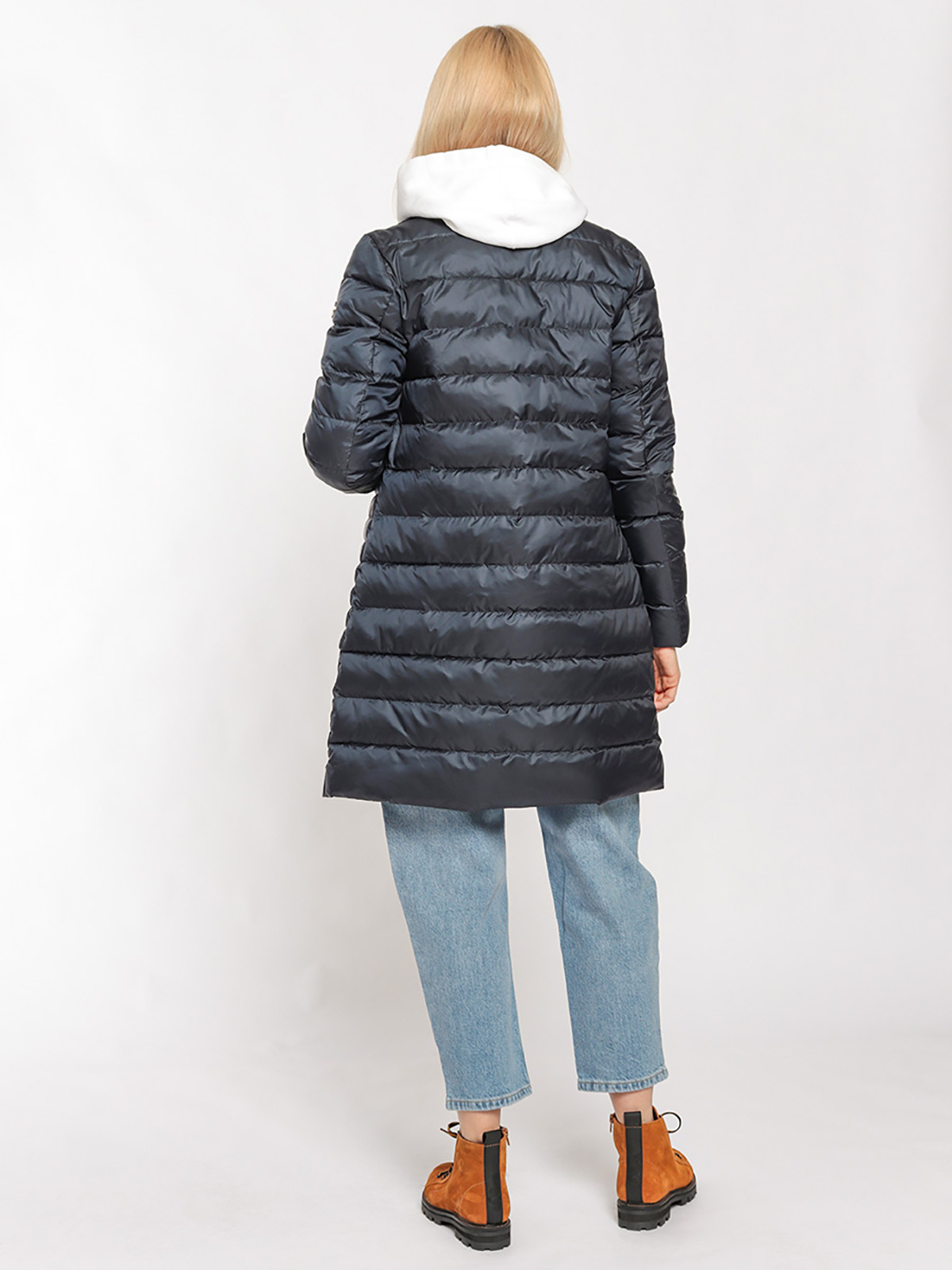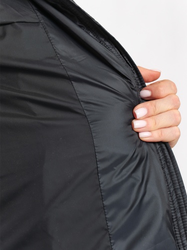 Стеганая однотонная куртка длиной до середины бедра. Застежка молния, боковые карманы на молнии.