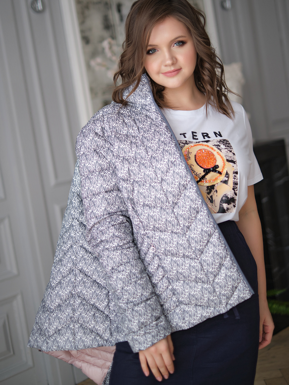 Легкая стеганая куртка с мелким ажурным узором по всей поверхности материала. Куртка изящно завершит весенний романтичный образ или подойдет для повседневного ношения. Воротник стойка защищает от ветра. Застежка молния, боковые карманы на молнии.