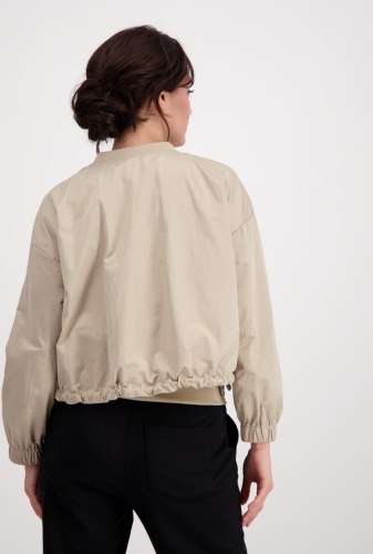 На сайте указаны Российские размеры. Короткая куртка с круглым вырезом и молнией. Прямой крой с круглым вырезом горловины в рубчик, манжетами на резинке и объемными плечами. Модель с длинными рукавами состоит из 2 слоев: верхний слой имеет боковые разрезы, кулиску и резинку с фиксатором шнура, а нижний слой имеет широкие манжеты в рубчик и потайные прорезные карманы. Параметры модели: 42 размер, рост 176 см