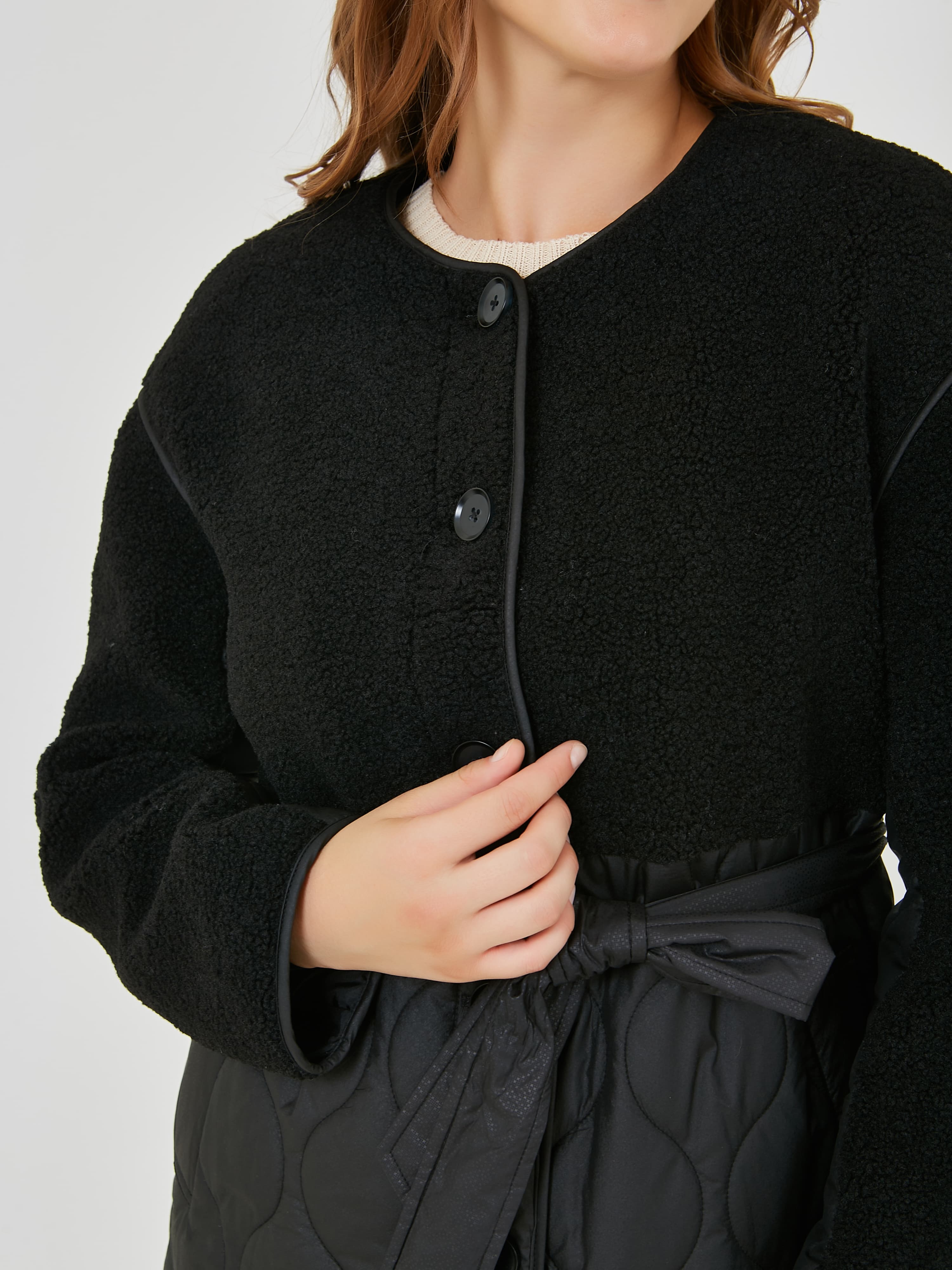 Пальто прямого кроя с крупными пуговицами сочетает мягкий светлый материал в верхней части с бежевым стеганым низом, придающим тепло и уют.Осень-Зима'25/26. Капсула "Вишневый сад". Параметры модели: 95-64-101, рост 175, размер 44-46