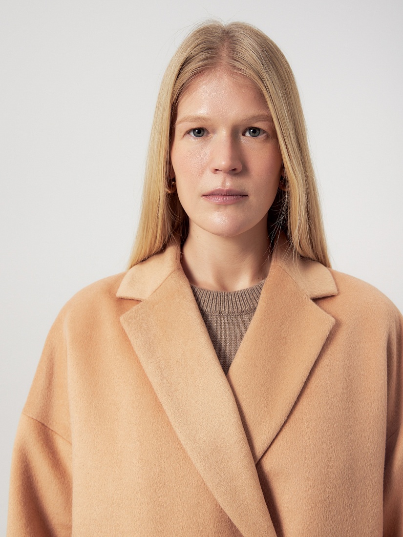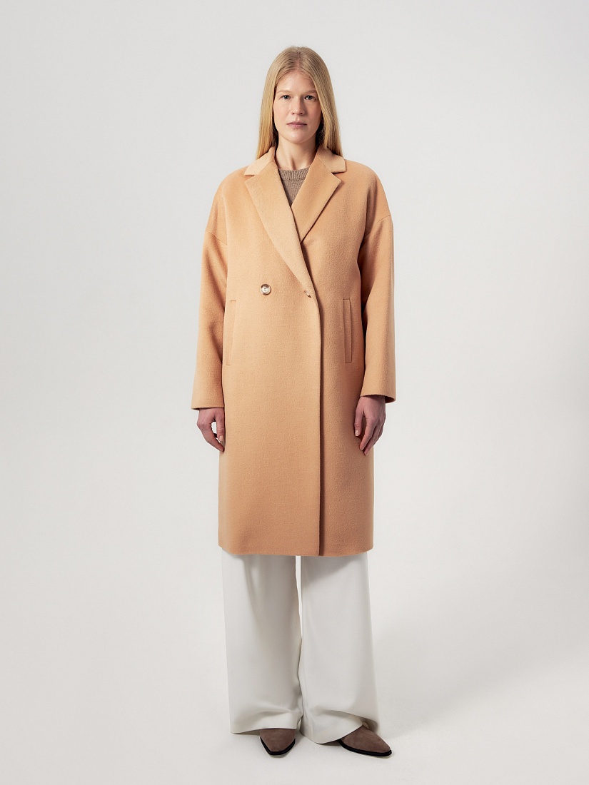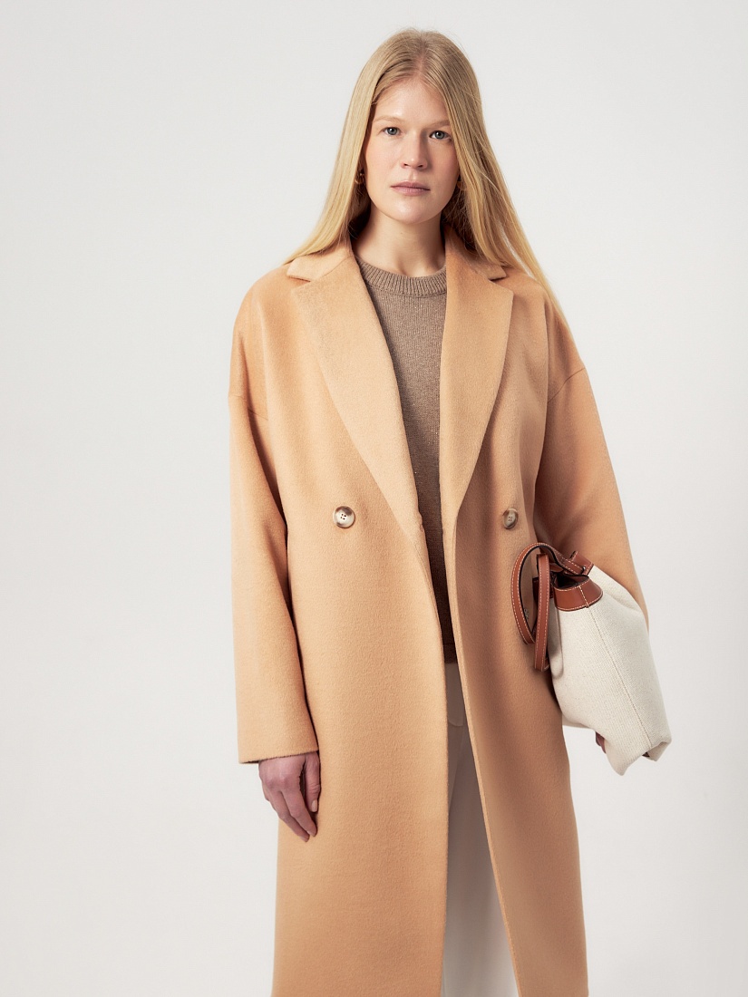 Двубортное укороченное пальто. Универсальная длина пальто чуть ниже колена позволяет с легкостью комбинировать его с любыми вещами. Комфортный рубашечный рукав дает возможность носить пальто даже на объемные вещи и при этом не стесняет движений, классический английский воротник придает пальто элегантности, а карманы-листочки служат дополнительным декоративным элементом, как и застежка на два ряда крупных пуговиц под натуральный рог.