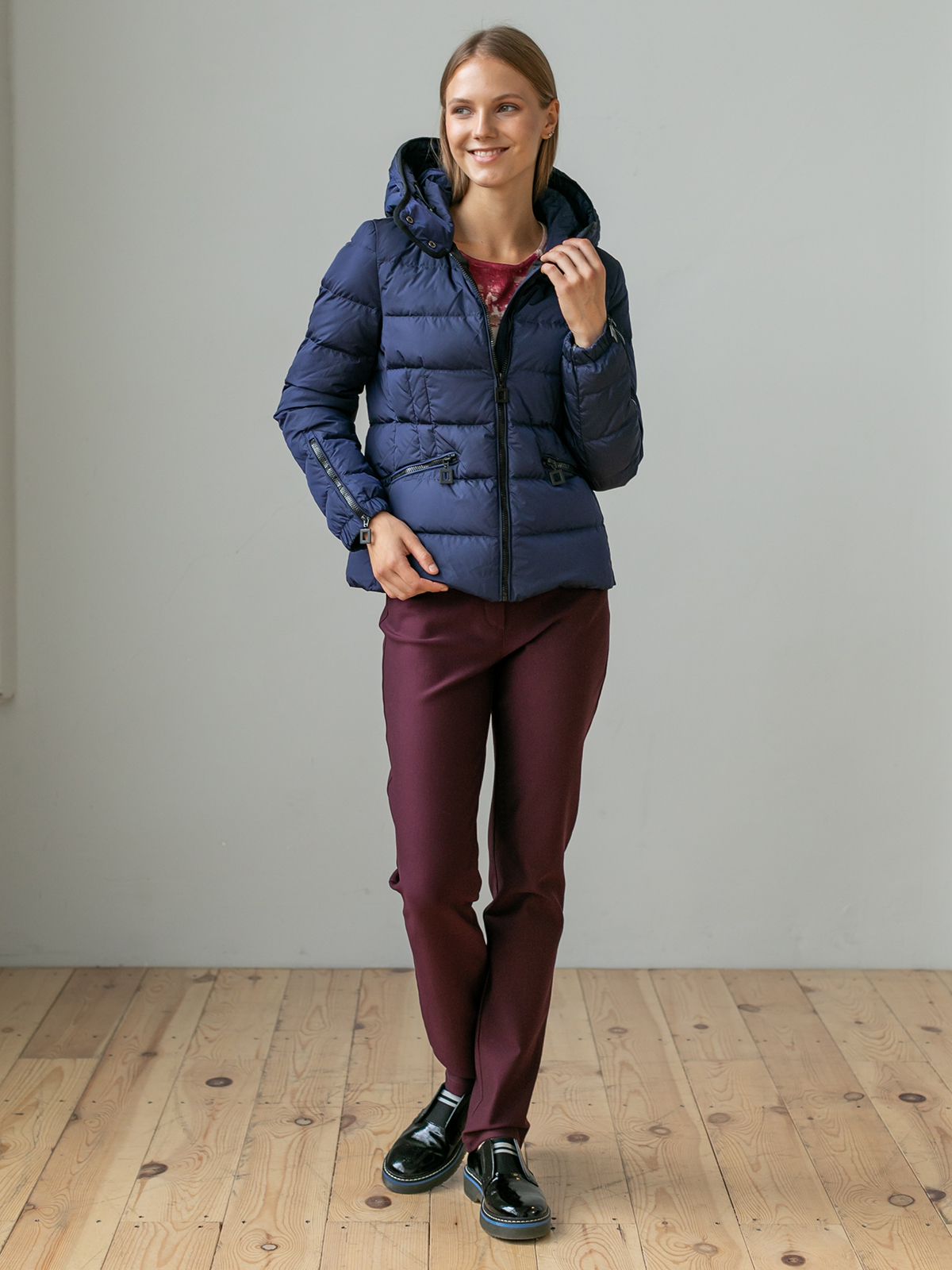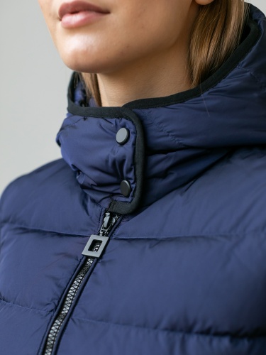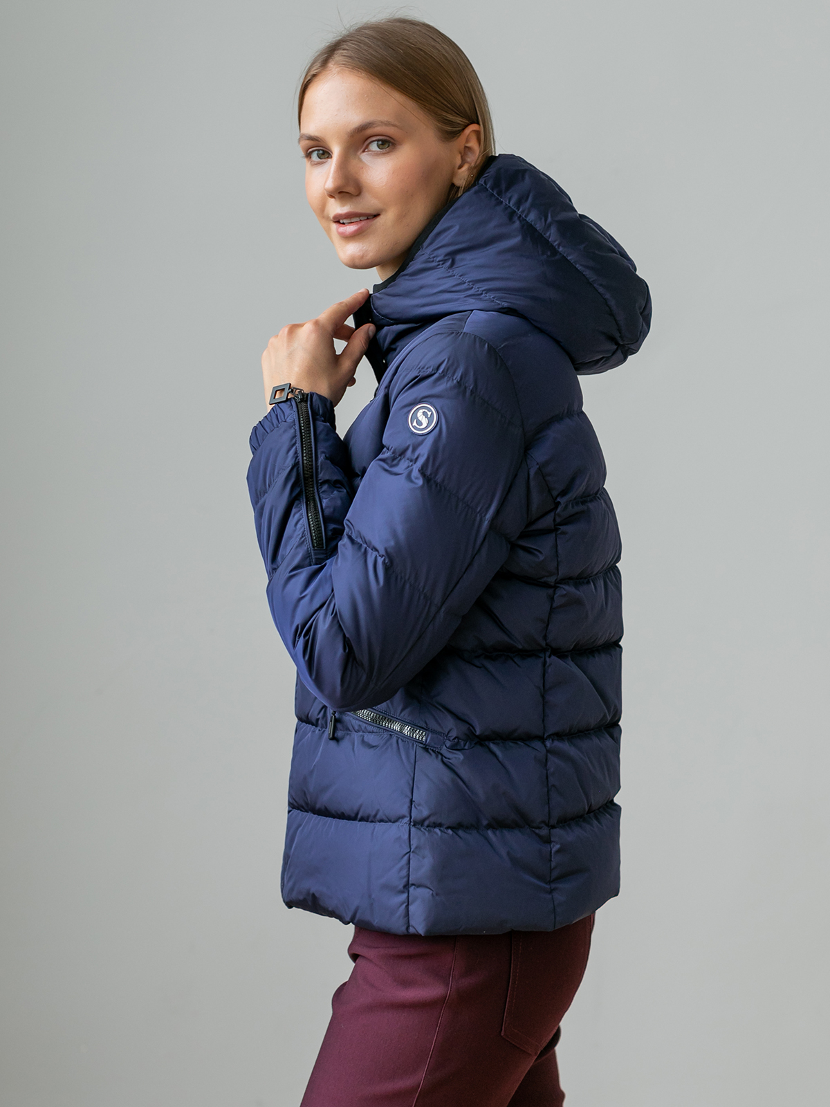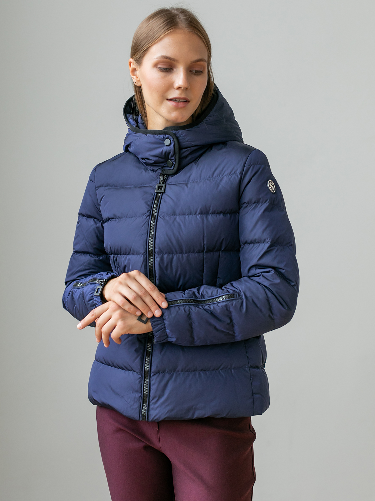 На сайте указаны российские размеры. Короткая пуховая куртка спортивного стиля. Карманы на молнии. Рукава оформлены замком-молнией. Капюшон фиксируется спереди кнопками, что позволяет защитить шею от ветра и холода.