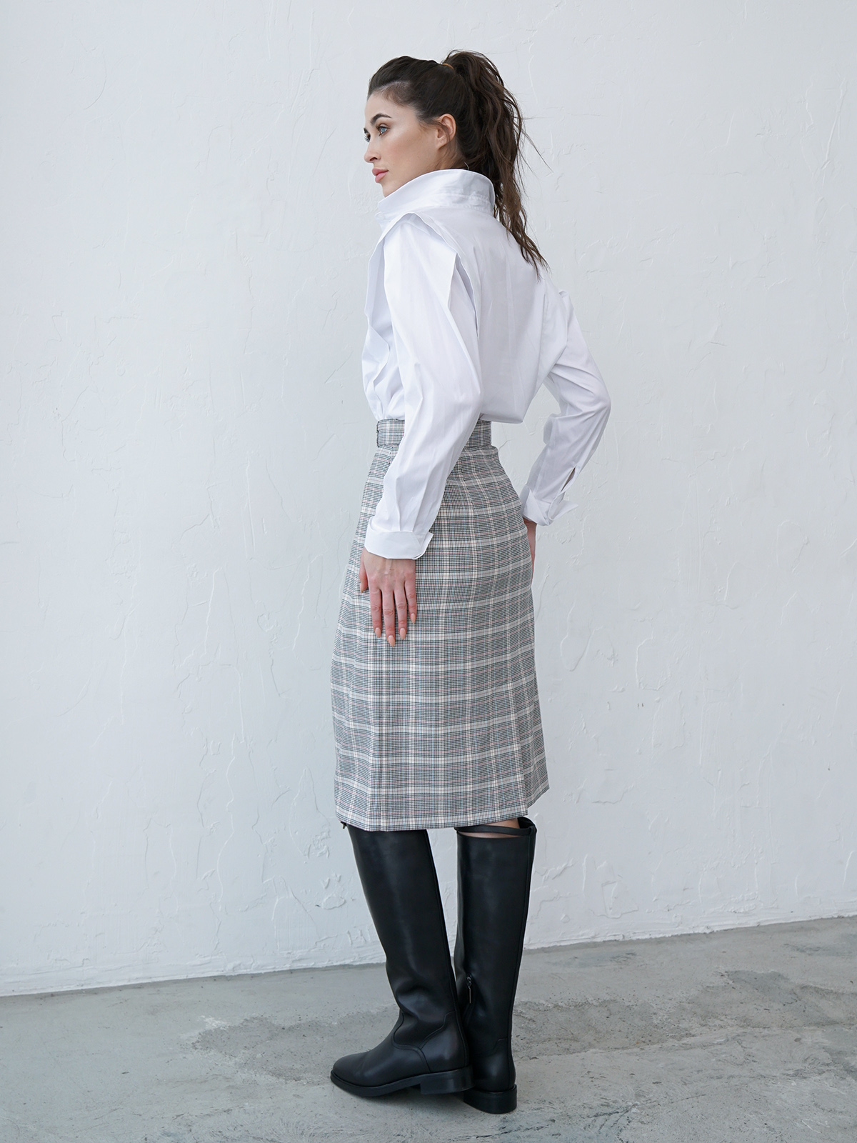 Юбка-карандаш в клетку. Застежка на молнию. В комплекте идет тканевый пояс.