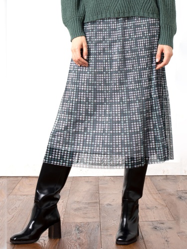 Двуслойная юбка в геометрическом узоре по всей поверхности изделия выполнена из полупрозрачного материала. Длина миди, комфортная посадка по естественной линии талии. Эластичный пояс обеспечивает комфортное ношение.