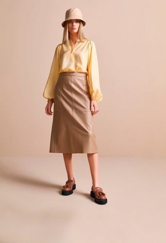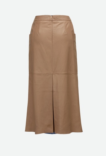 На сайте указаны Российские размеры. Юбка А-силуэта длиной до колена из мягкой гладкой кожи наппа с двумя прорезными карманами справа и слева привлекает внимание. Коробчатая складка на спине обеспечивает комфортную свободу движений. Сочетайте его со струящимися блестящими топами, чтобы создать изысканный образ, или с тонким трикотажем, чтобы создать более повседневный образ. Рост модели на фото - 176 см