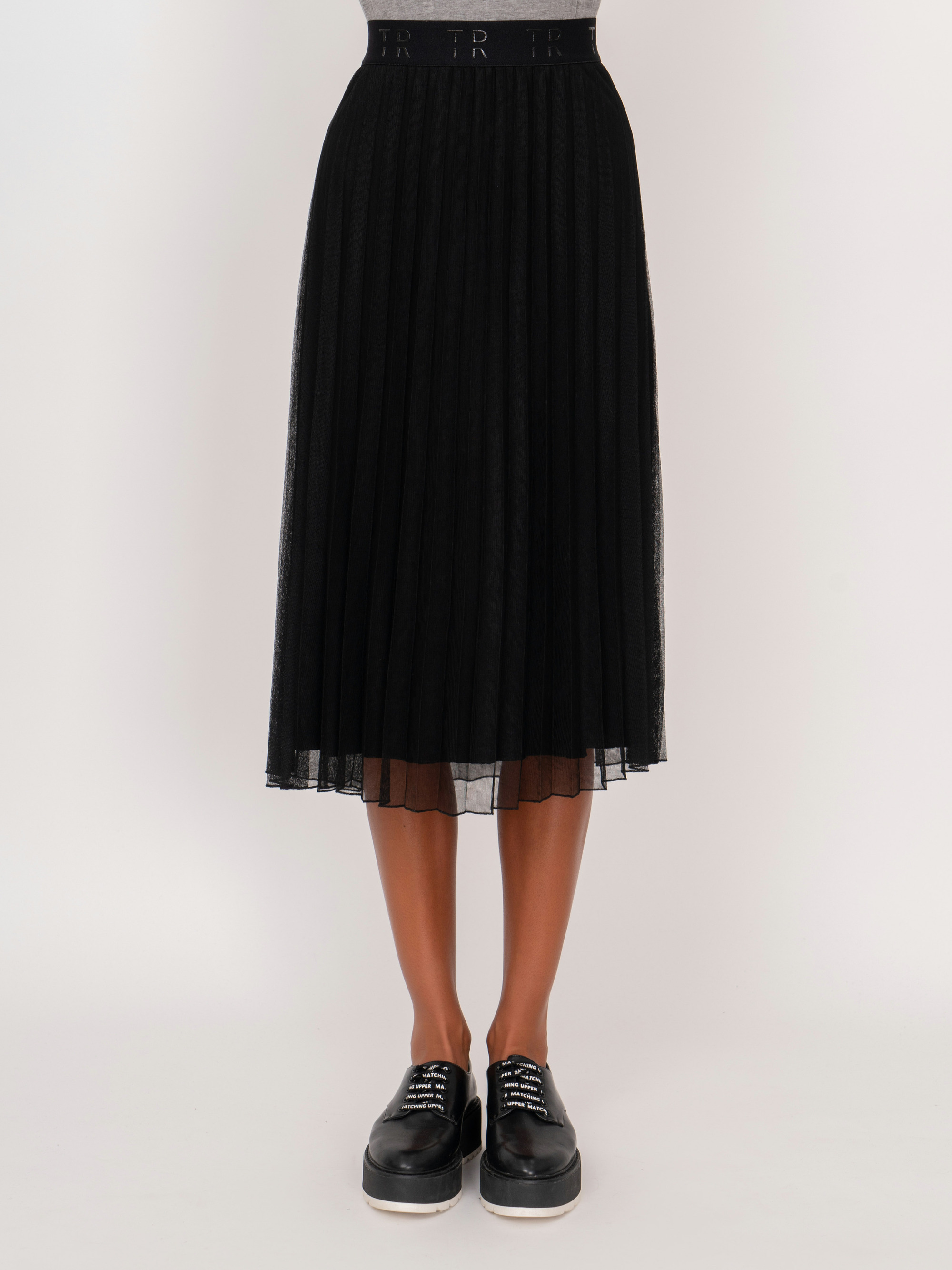 На сайте указаны российские размеры. Черная плиссированная миди юбка трапеция на резинке. Рост модели: 175 см. Длина юбки: 70 см.