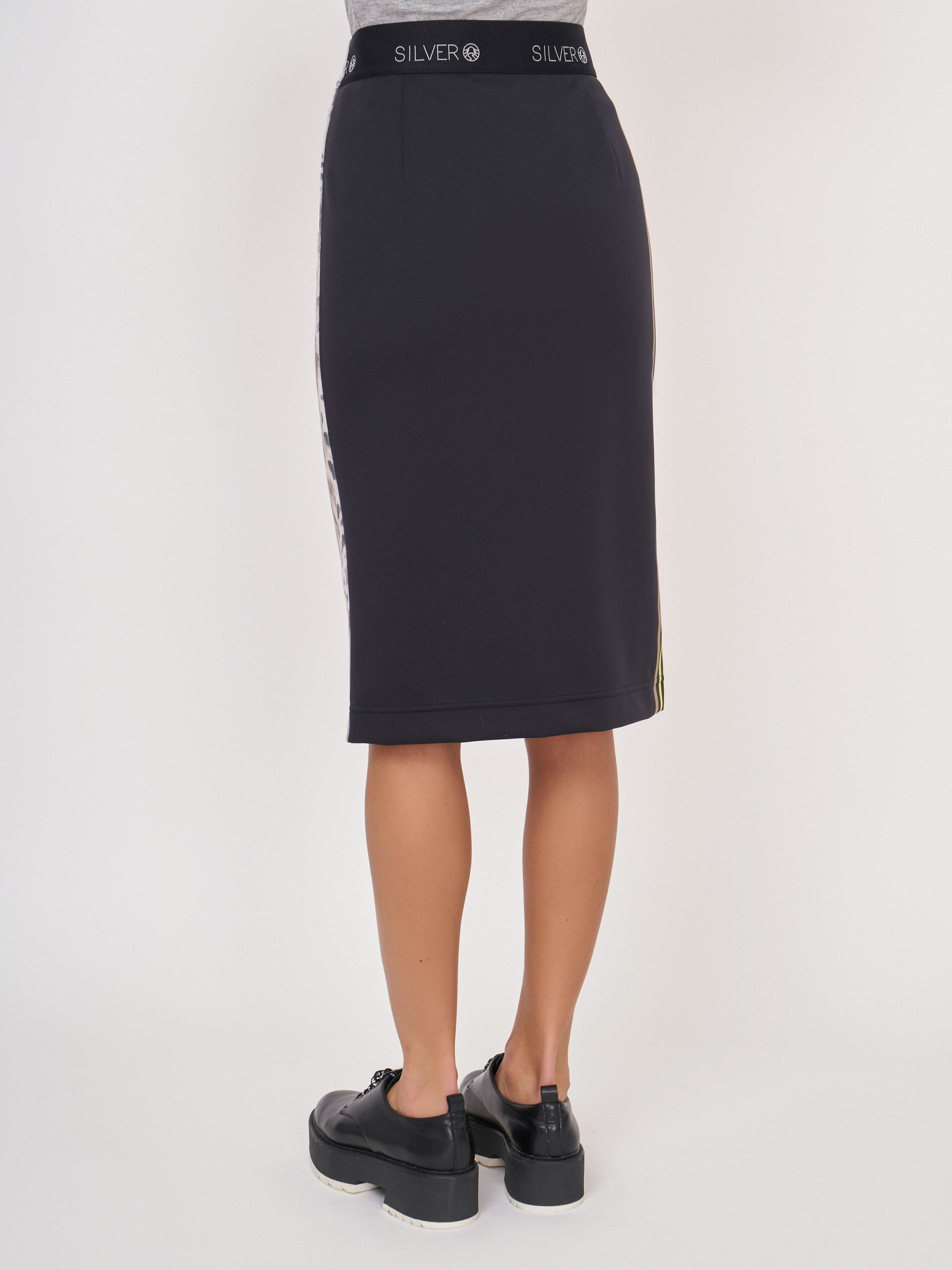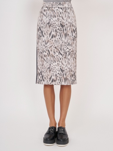 На сайте указаны российские размеры. Прямая трикотажная миди юбка на резинке с леопардовым рисунком и полосками. Длина по спинке: 60 см. Рост модели: 175 см.