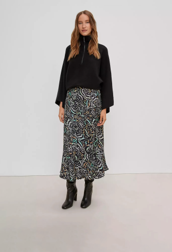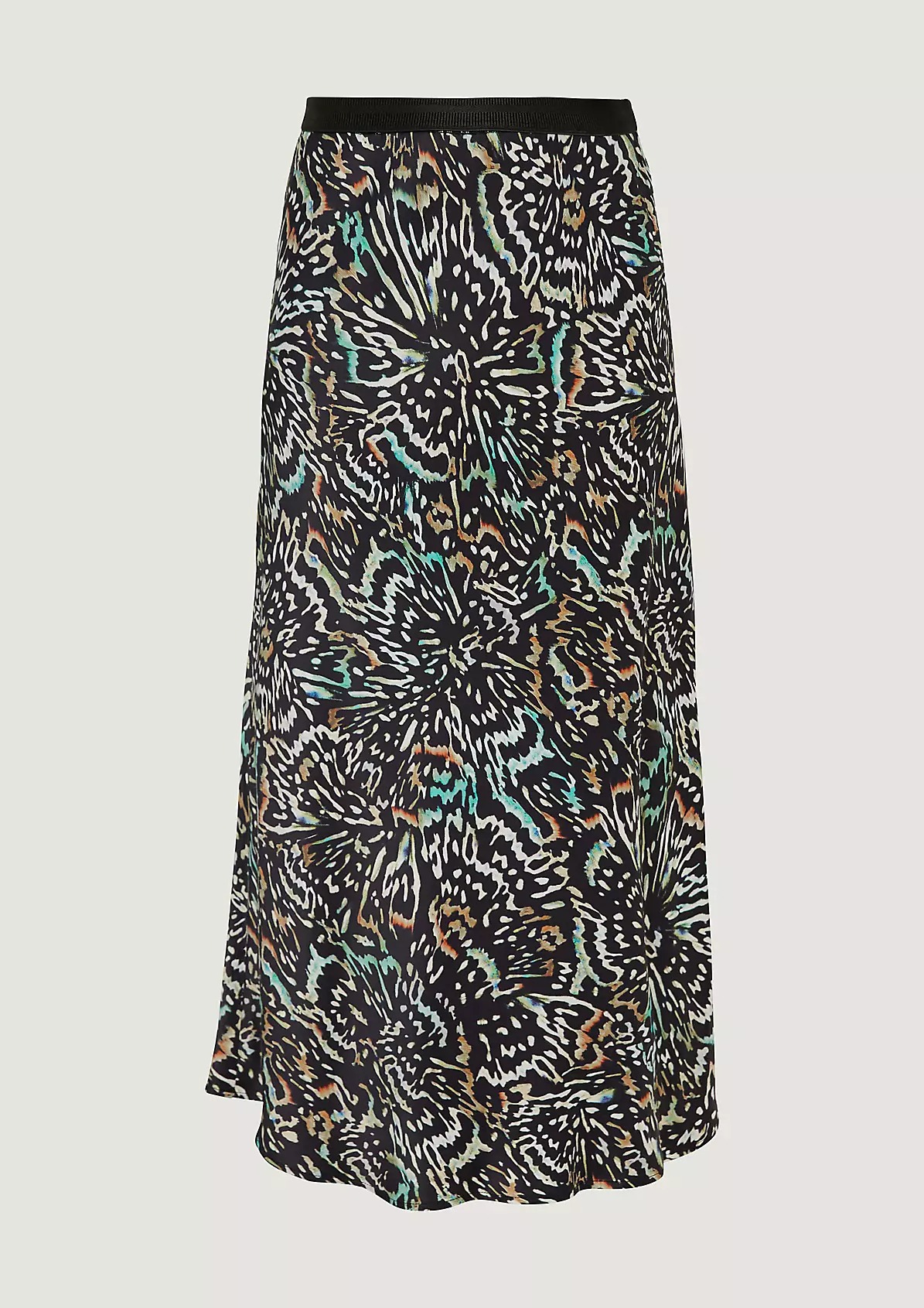 На сайте указаны российские размеры. Атласная юбка со сплошным принтом длины миди. Эластичный пояс. Длина спины: 73,5 см в размере 42. Рост модели 178 см