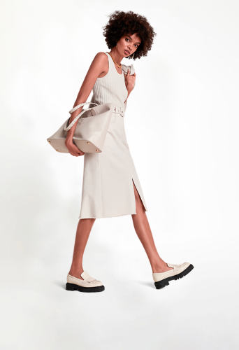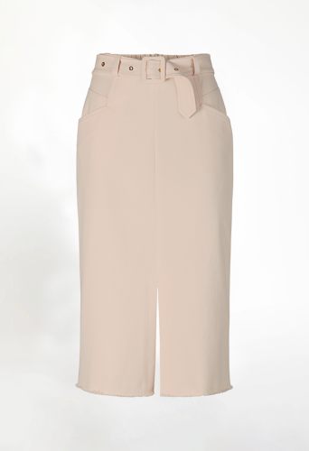 На сайте указаны российские размеры. Прямая юбка-миди с шикарным поясом из биэластичного органического хлопка стрейч относится к этой категории и очень легко комбинируется. Очень непринужденно, например, с рубашкой в рубчик и мокасинами. Модель ростом 180 см.