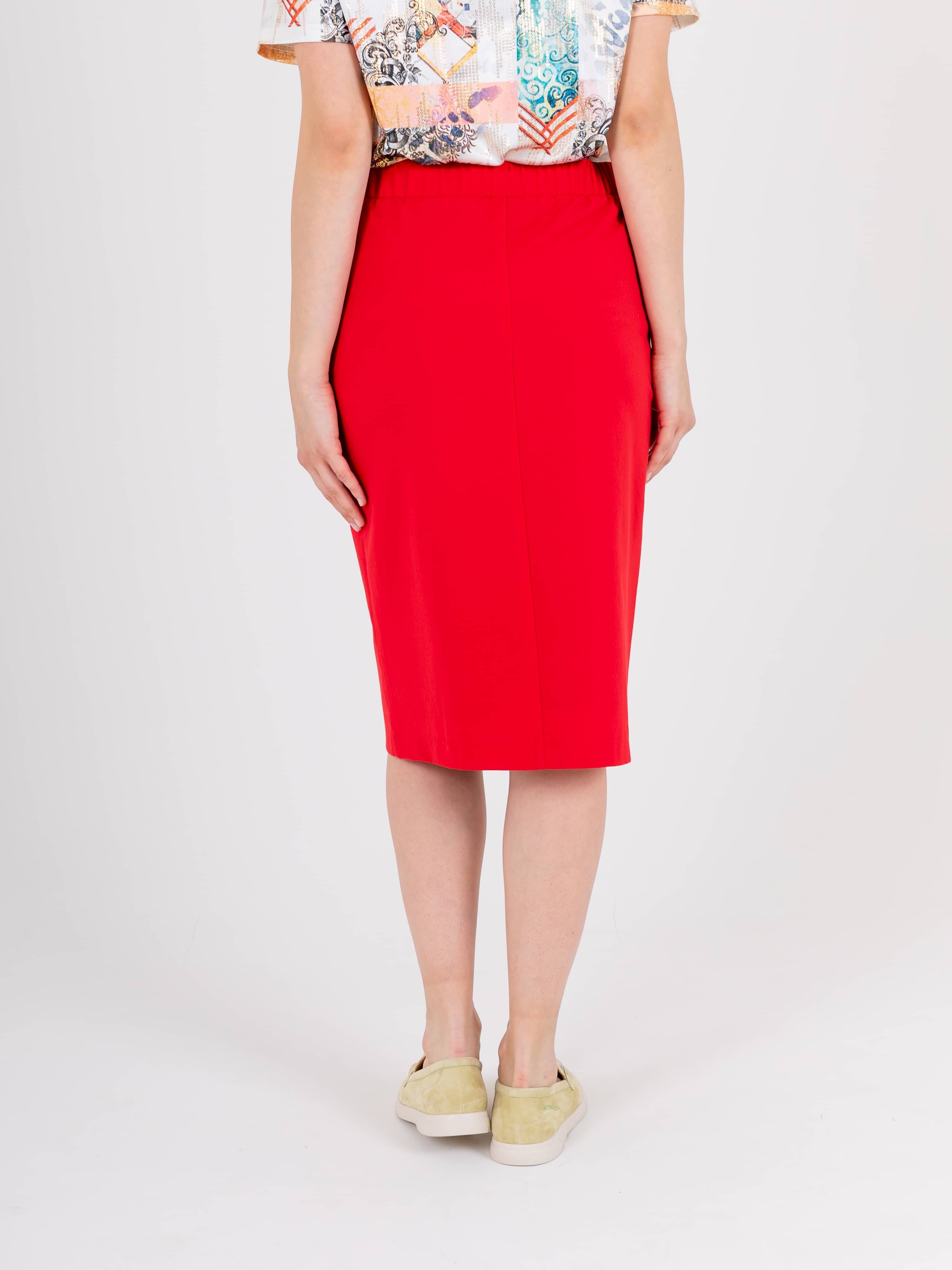 Яркая юбка-карандаш длиной ниже колена из полиэстера с добавлением мягкой вискозы и эластана. На переднем полотнище юбки расположены два кармана с отрезным бочком. Верх юбки обработан поясом на резинке.