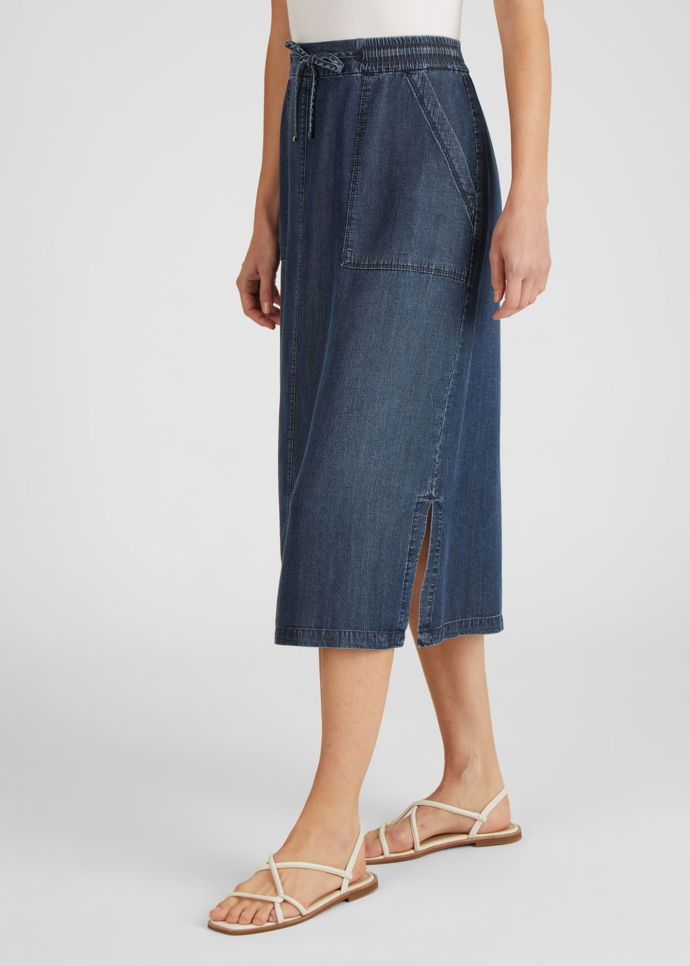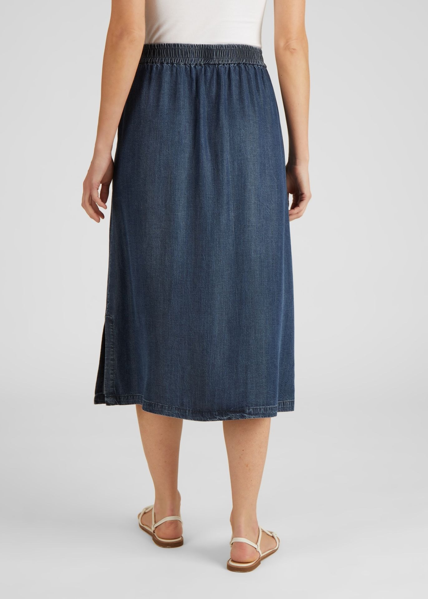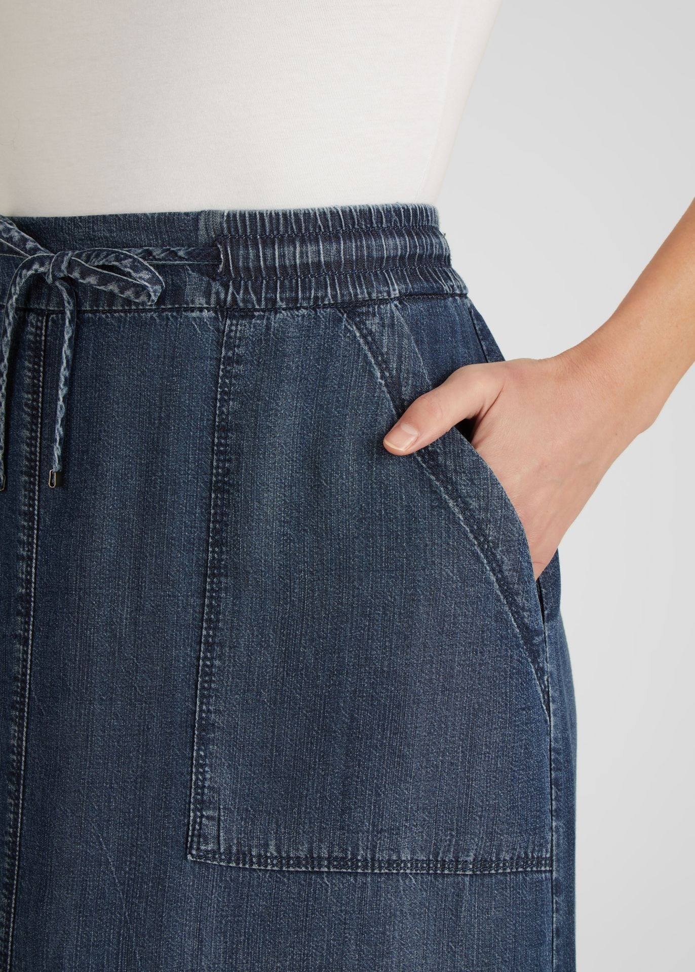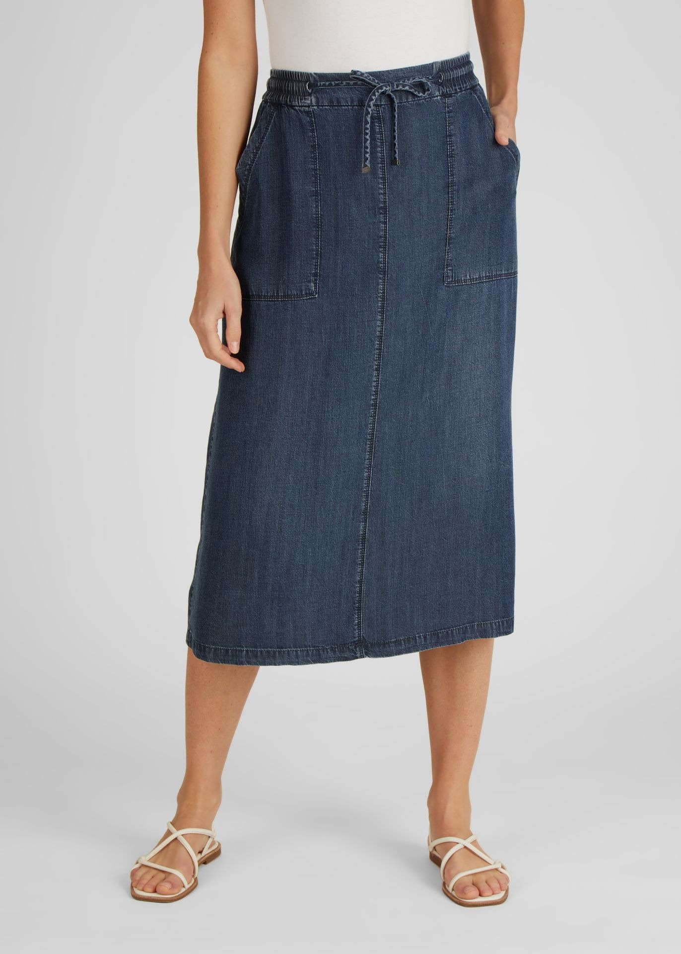 Эта джинсовая юбка - идеальный предмет весеннего гардероба! Длина до икры, два боковых кармана и свободный крой обеспечивают свободу движений. Эластичная лента и шнурки обеспечивают индивидуальную регулировку по фигуре. Модный джинсовый образ придает юбке повседневный вид, что делает ее идеальной для повседневного ношения. Общая длина в размере 46: 80см