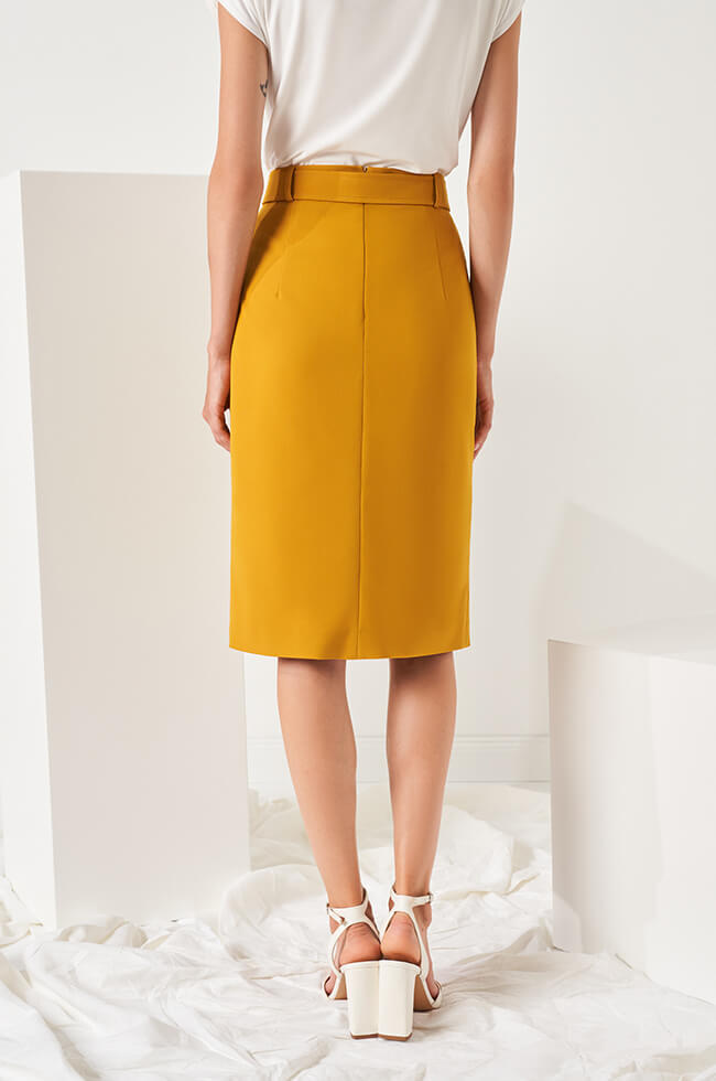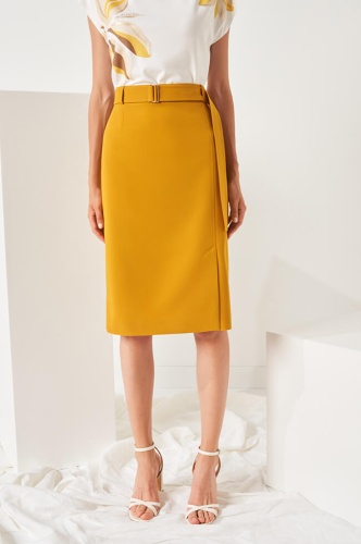 Юбка прямого силуэта на подкладке, выполнена из костюмного полотна. Притачной пояс со шлевками. Спереди выполнен деликатный разрез. Дополняется поясом из основного полотна с прямоугольными пряжками.