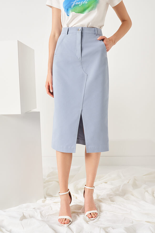 Прямая юбка миди из денима. Притачной пояс со шлевками. Застежка на молнию и пуговицу. Спереди косые боковые карманы. Спереди фигурный центральный шов заканчивается разрезом. Спинка с кокеткой и накладными карманами.