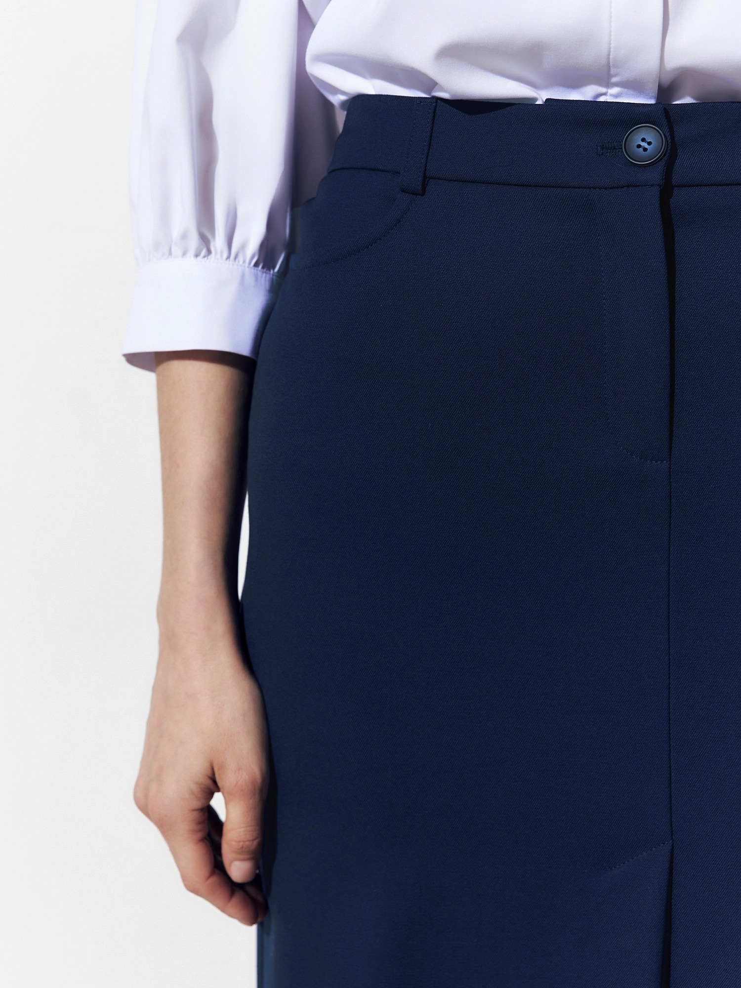 Юбка полуприлегающего силуэта на притачном поясе со шлевками. Выполнена из костюмной ткани с добавлением вискозы. Спереди у юбки имеется шлица для удобства шага. Функциональные карманы джинсовой формы и два ложных прорезных кармана сзади. Юбка составляет хорошую пару с прямым жакетом в полоску из одной капсулы.