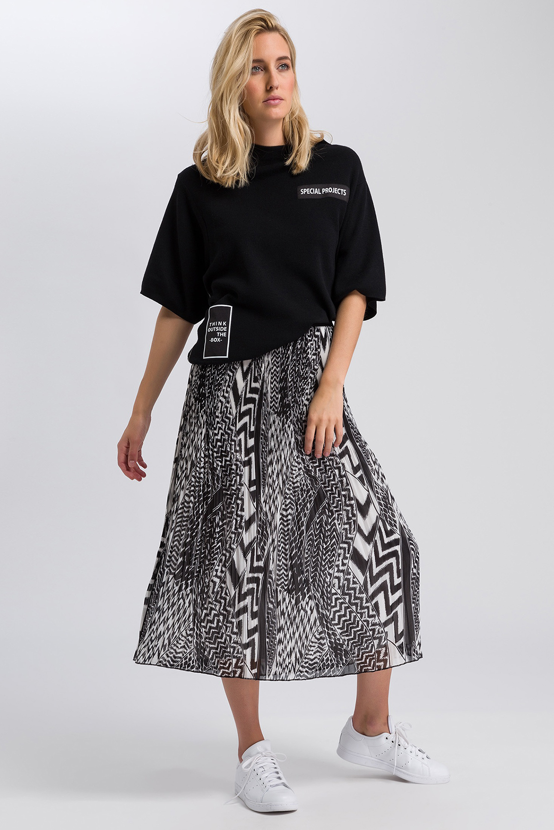 Плиссированная юбка с абстрактным принтом. Трендовая длина миди. Эластичный пояс обеспечивает комфортную посадку. Застежка и карманы отсутствуют.