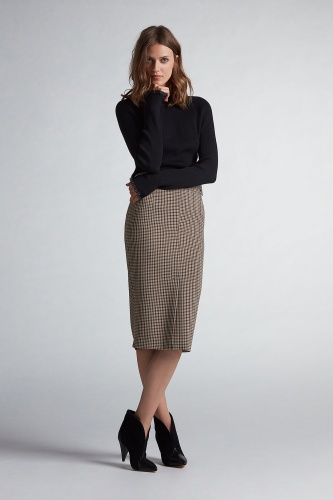 Классическая юбка-карандаш удивляет количеством модных элементов! Средняя посадка, длина чуть ниже колен. Трендовый принт в клетку. Разрез со шлицей спереди. Декоративный пояс на цепочке. Эта юбка станет изюминкой множества стильных образов.