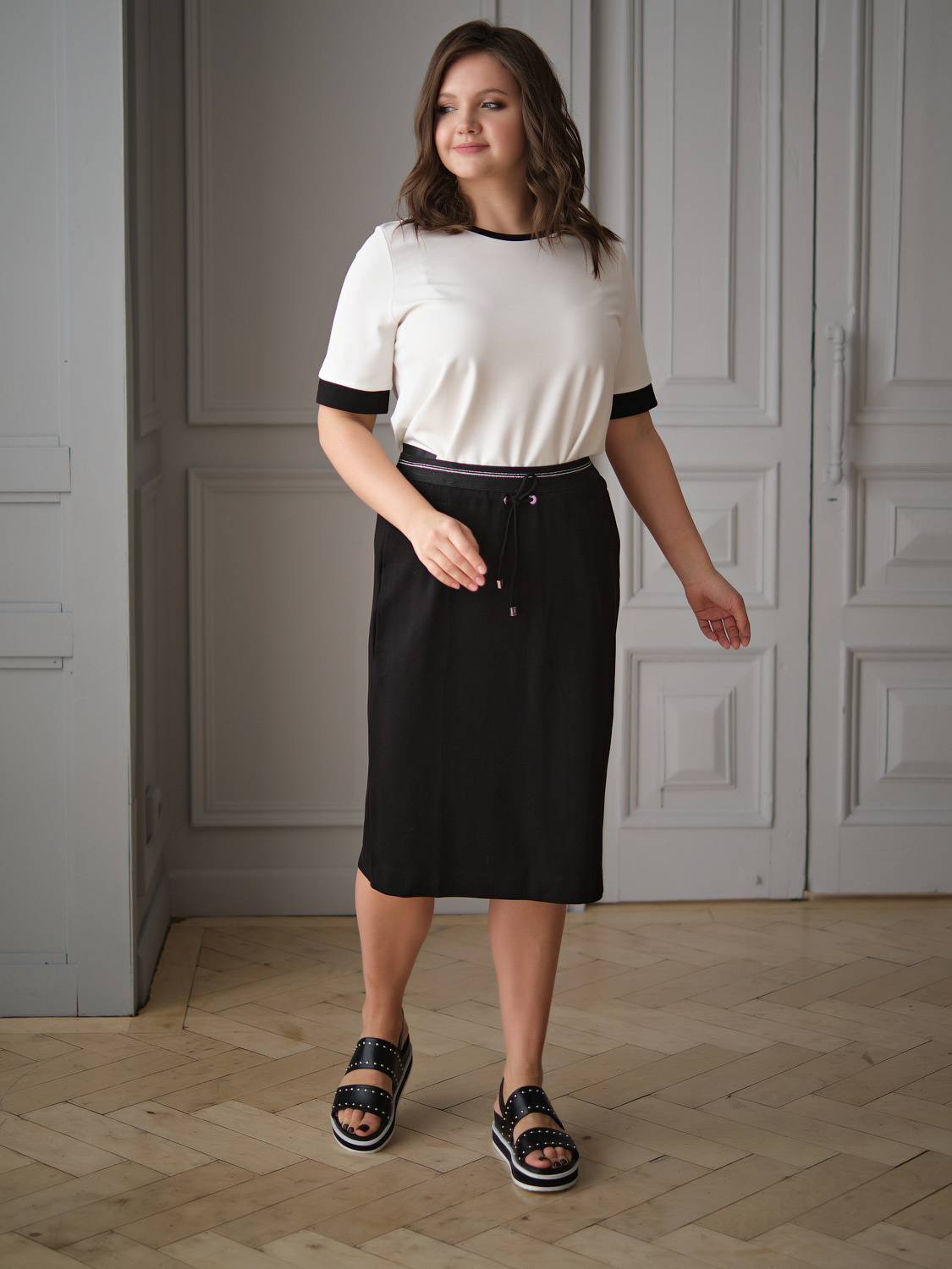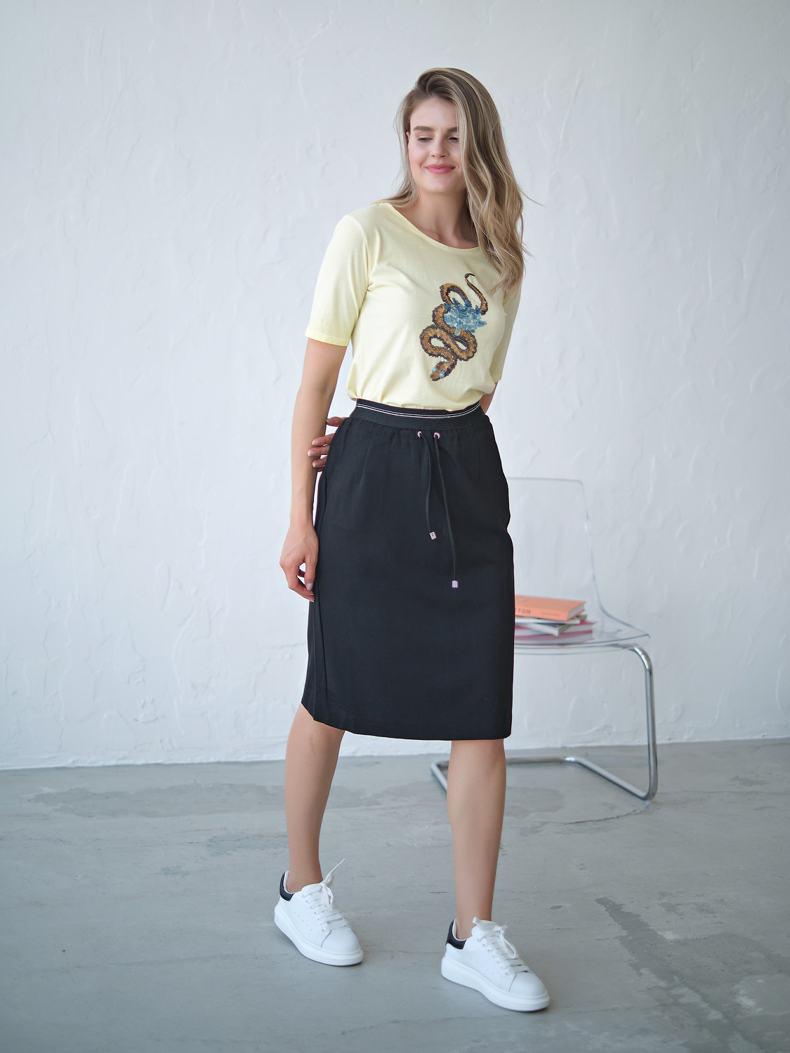 Юбка прямого кроя. Универсальная длина до колена. Прорезные карманы. Шнуровка на талии.