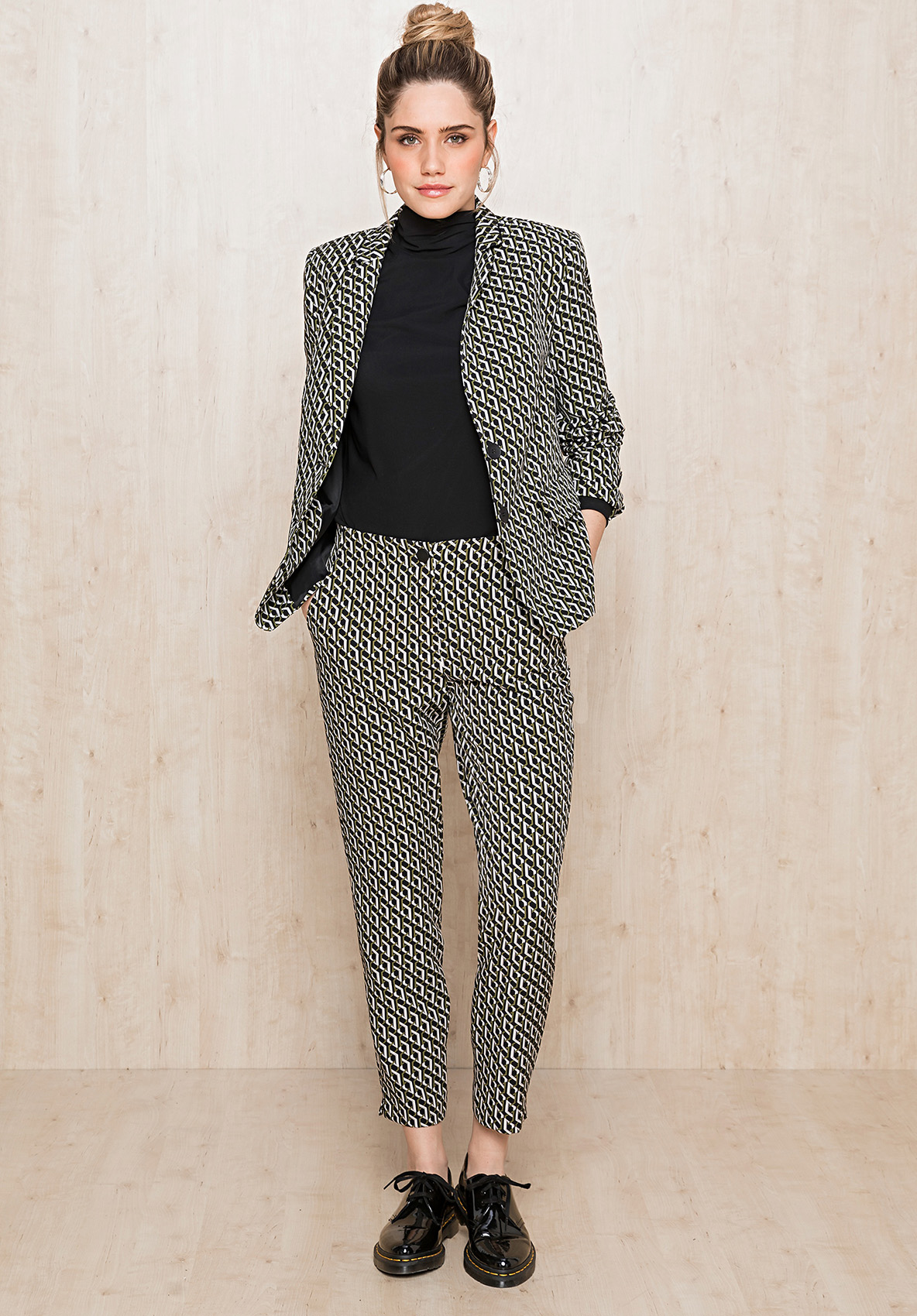 Слегка приталенный жакет с геометрическим принтом привлекает внимание. Черно-белый цвет с серо-зелеными акцентами подчеркивает любой наряд. Завершают образ такие модные акценты, как карманы с клапанами, застежка на пуговицы и стильный воротник с лацканами.