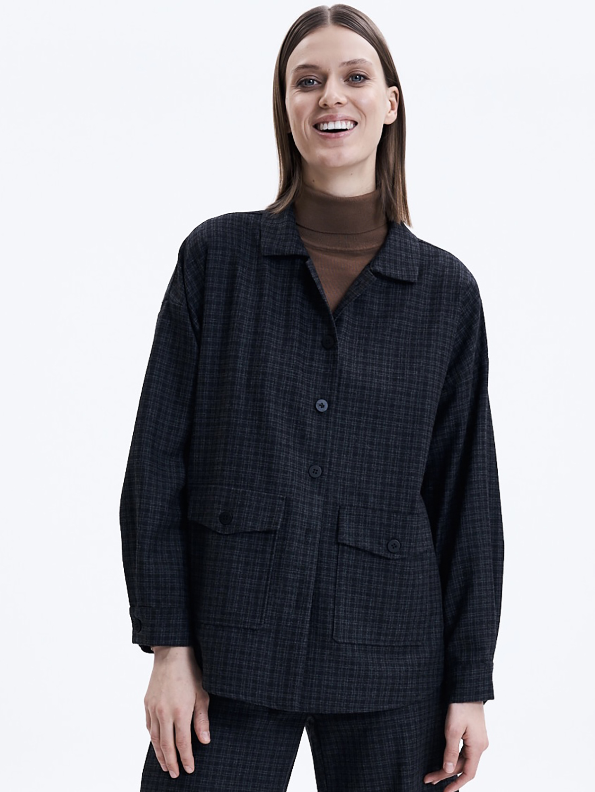 Жакет свободного кроя на пуговицах. Отложной воротник, накладные карманы с клапанами, втачной рукав полной длины.