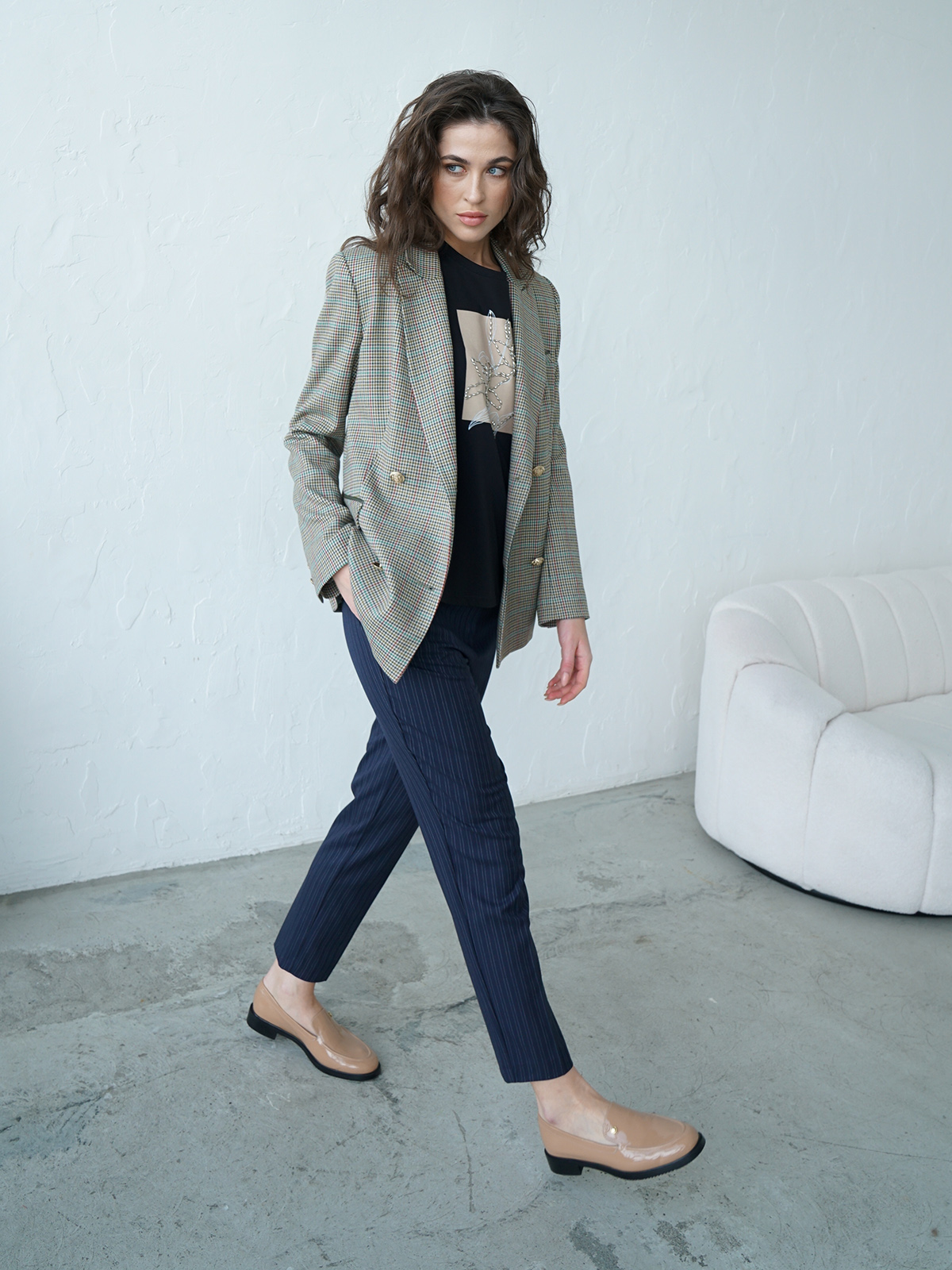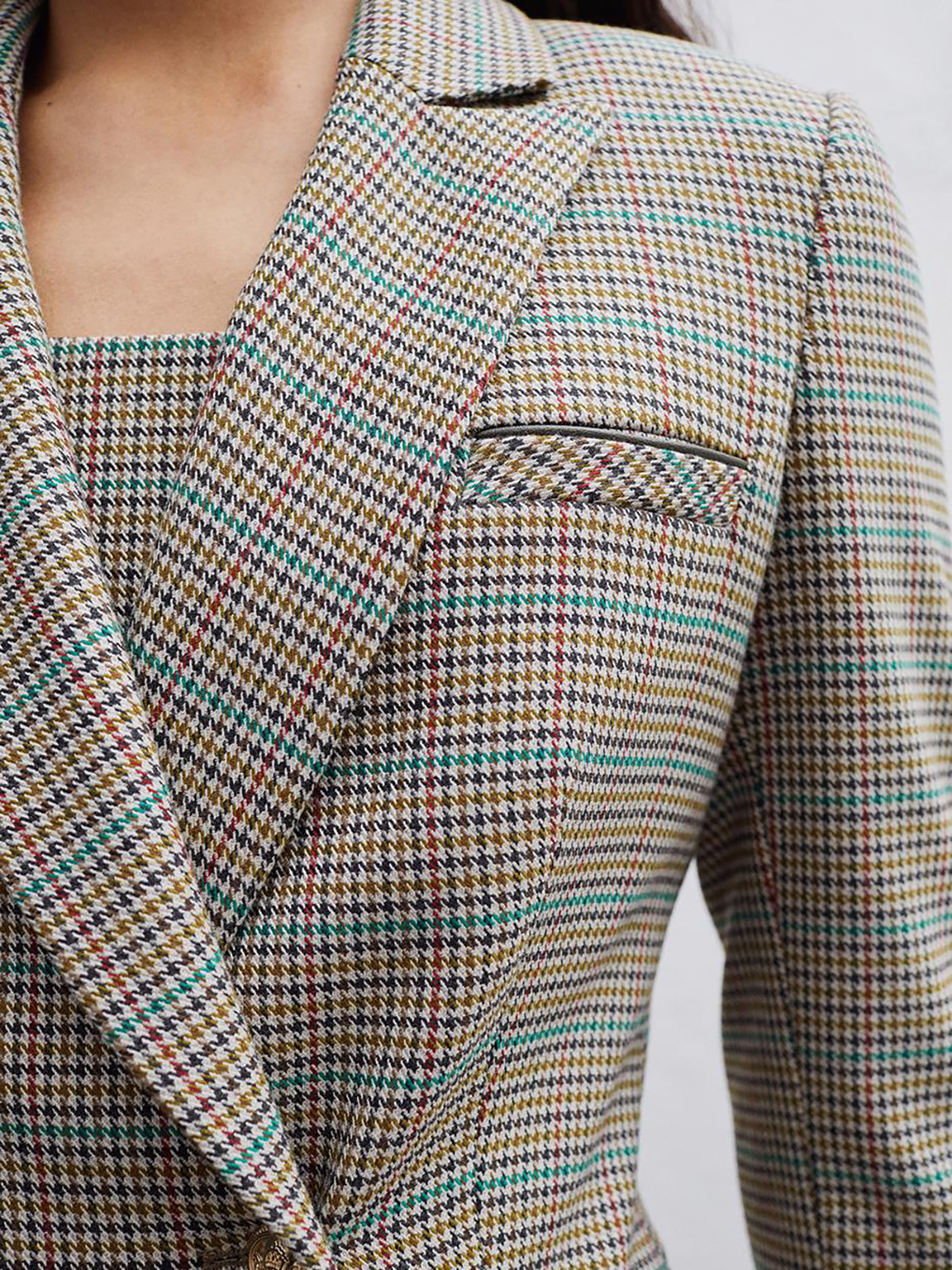 Двубортный жакет в мелкую клетку. Приталенный силуэт, английский воротник с лацканами. Длинный втачной рукав, боковые карманы с клапаном.
