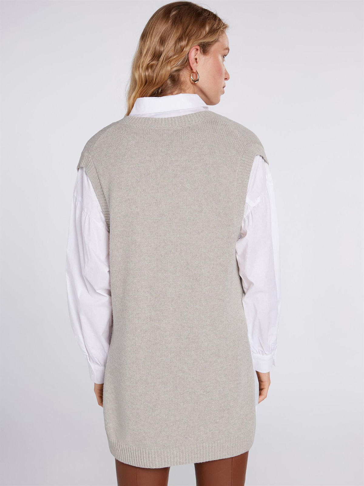 Удлиненный трикотажный жилет в базовом оттенке. V-образный вырез горловины, прямой крой.