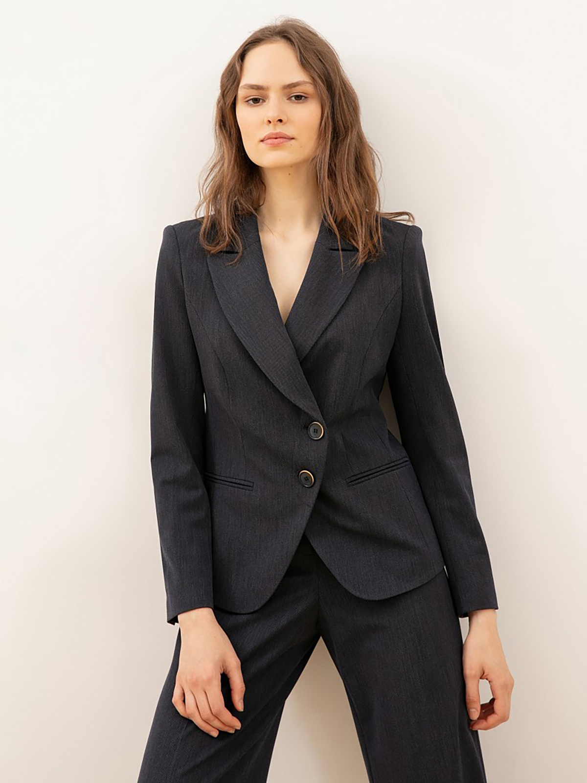 Укороченный жакет полуприлегающего силуэта. Ассиметричная застежка на две пуговицы. Английский воротник с лацканами, карманы в рамку.