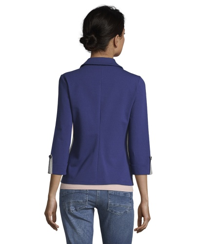 Классический жакет - абсолютно необходимый элемент женского гардероба! Слегка приталенный крой подчеркивает достоинства фигуры. Отложной воротник, застежка на пуговицах, рукава 3/4 с патой для подворачивания, карманы с отделкой. Блестящая тесьма придает образу нотку гламура. Материал из хлопковой смеси приятен к телу и обеспечивает комфорт. Этот жакет будет изюминкой как делового, так и кэжуал образа.