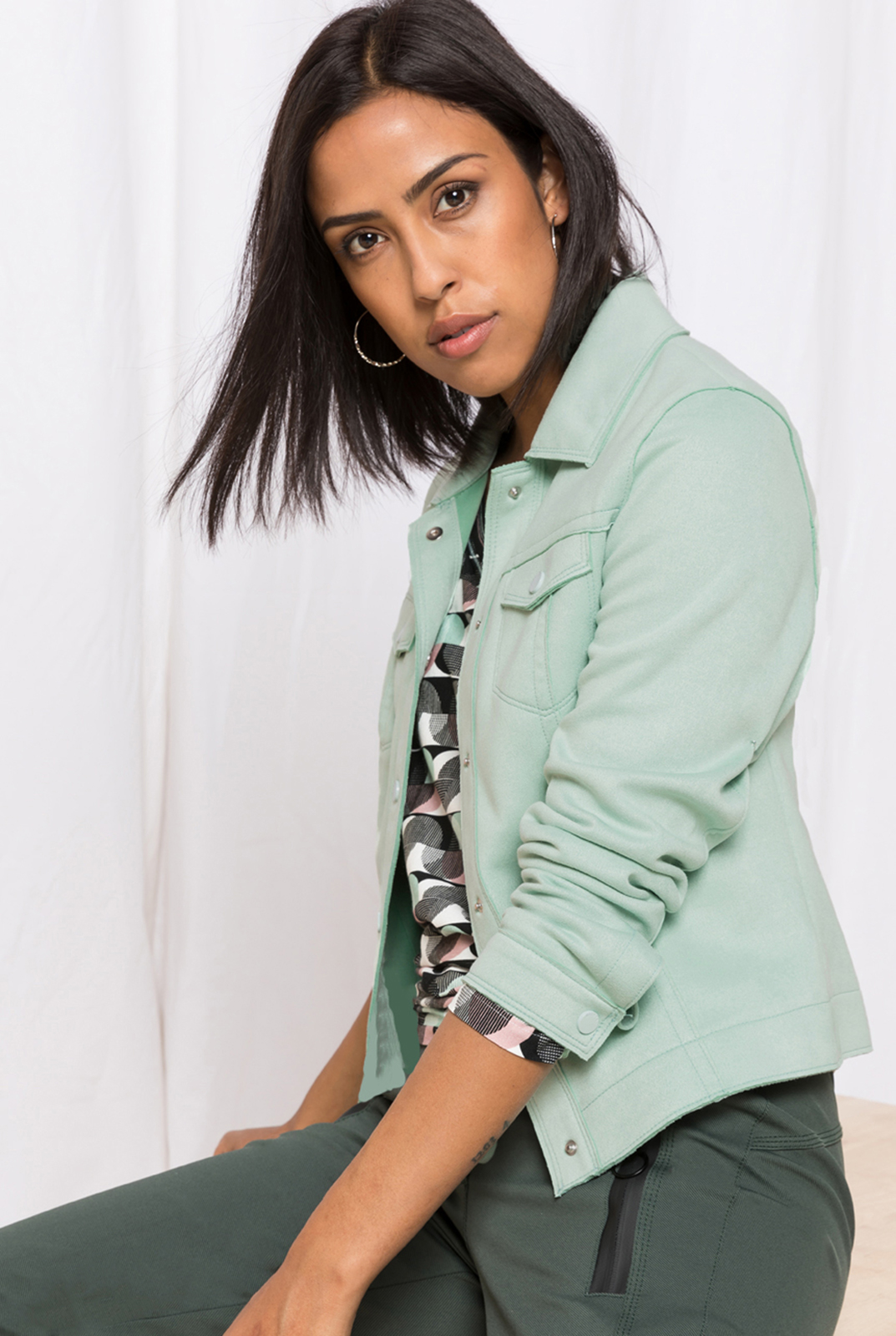 Приталенный жакет нежного мятного оттенка. Воротник с отворотами. Втачной рукав полной длины с манжетой на пуговице. Накладные карманы на груди. Застежка на клепки.
