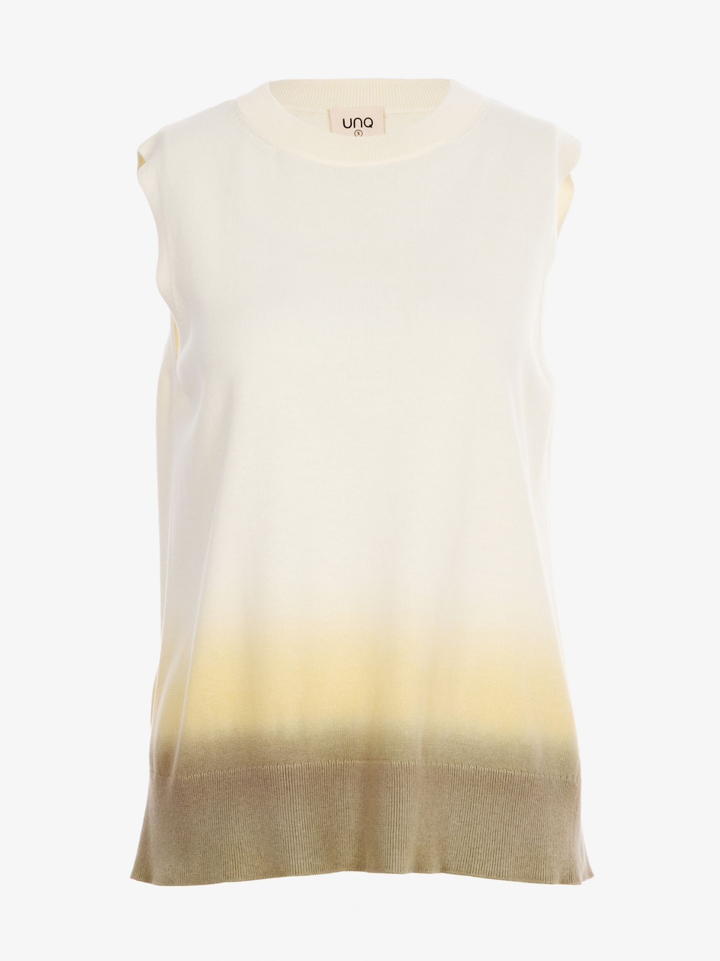 Свободный трикотажный топ без рукавов. Узкая круглая шея с рубчатыми манжетами.