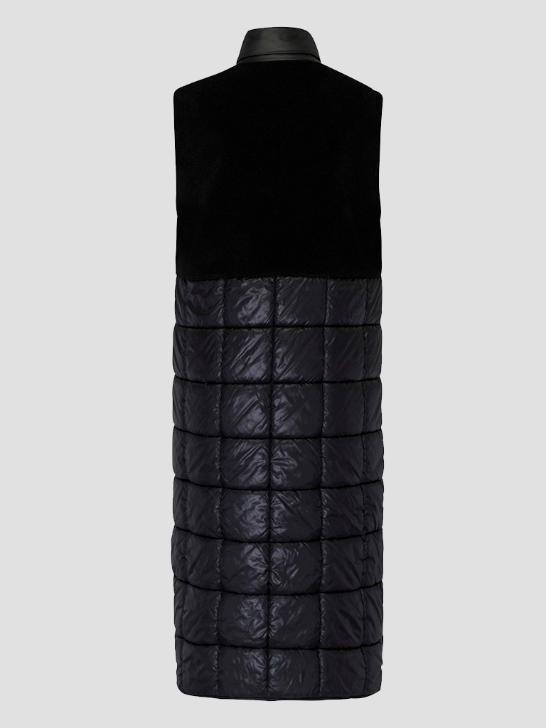 На сайте указаны российские размеры. Жилет с отделкой из искусственного меха в области плеч и груди, которые переходят в квадратный стеганый рисунок на уровне талии. Сквозная панель с кнопками легко открывается и закрывается. Высокий воротник, пуговицы по низу и боковые карманы делают образ идеальным.