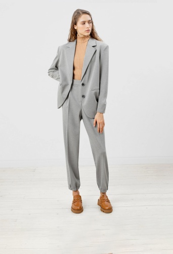 На сайте указаны Российские размеры Стильный жакет на подкладке удлиненного прямого силуэта из трикотажного полотна с v-образным вырезом, английским воротником и укороченным втачным рукавом. Низ бортов закруглённый. Спереди рабочие карманы в рамку и застежка на две пуговицы. Рост модели на фото - 175 см.