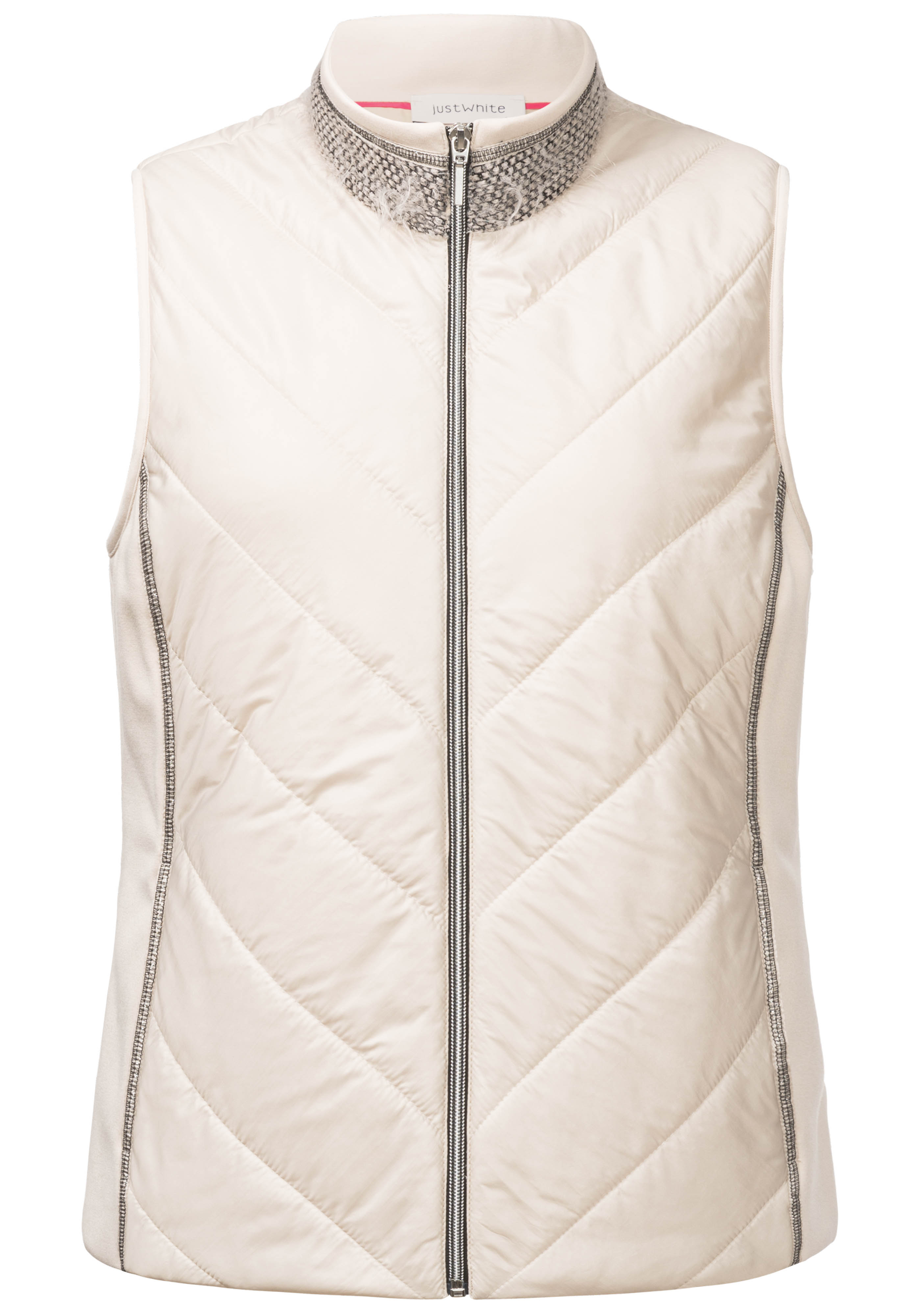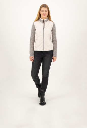 На сайте указаны российские размеры. Стеганая безрукавка из эксклюзивного сочетания материалов с элегантной трикотажной вставкой. Изюминкой стеганого жилета являются модный вязаный воротник и блестящие контрастные швы. Двусторонняя молния и высокий застегивающийся воротник особенно практичны и подчеркивают приятный комфорт при ношении. Наша модель ростом 177 см. Измерения для 44 размера: Окружность груди: 102 см Талия: 95,1 см Бедра: 42 дюйма Длина спинки: 60 см.