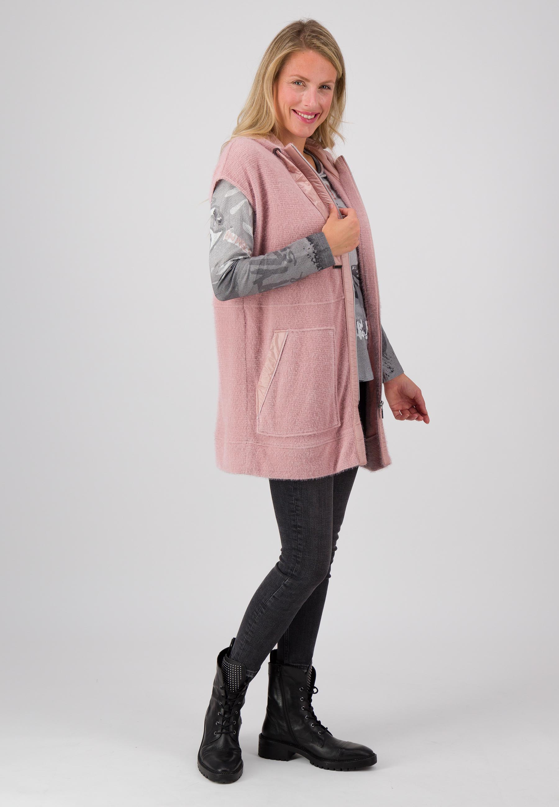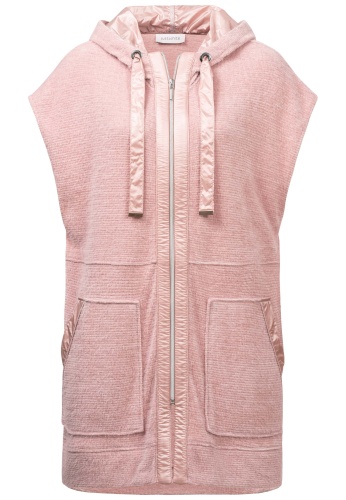 На сайте указаны российские размеры. Длинный жилет из удивительно мягкого материала впечатляет своей длинной посадкой и широкими плечами, которые можно легко сочетать с шикарной блузкой или классической рубашкой с длинными рукавами. Красиво мерцающий контрастный материал используется не только на внутренней подкладке повседневного капюшона, но и на лямках капюшона, боковых карманах и высококачественной молнии. Модель ростом 177 см Измерения для 44 размера: