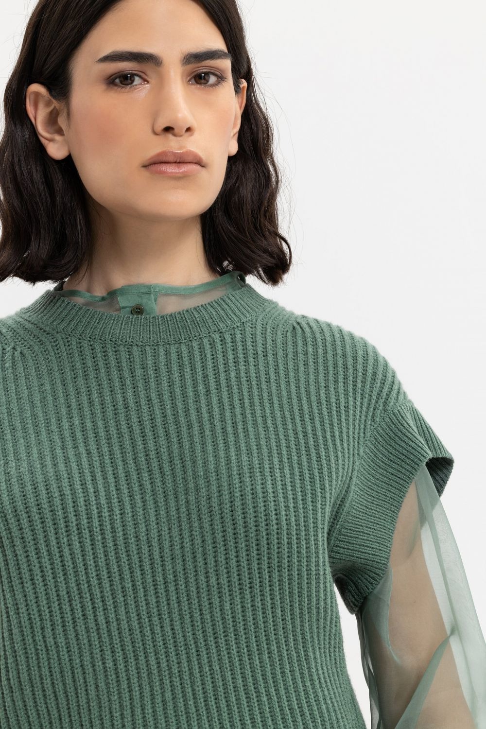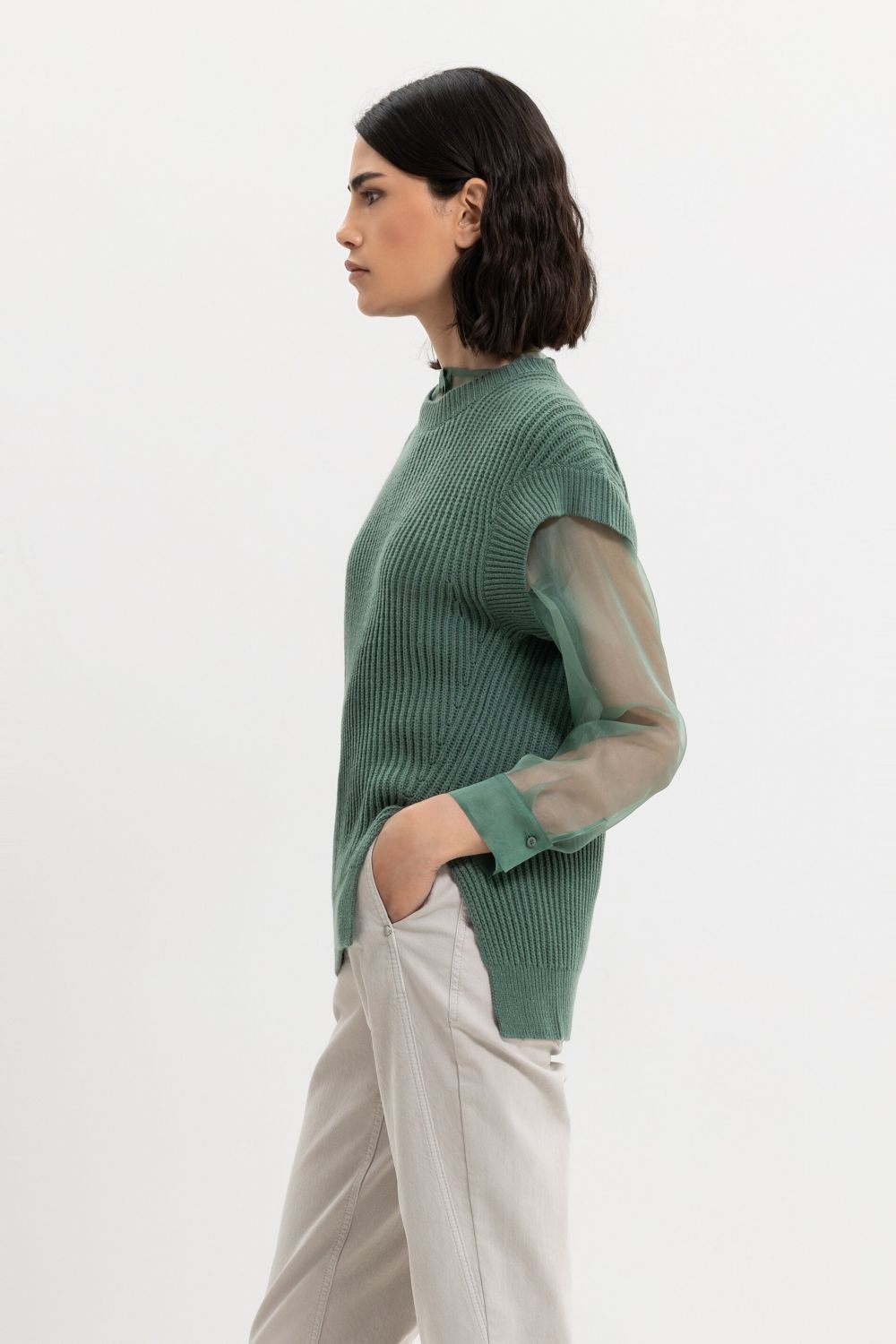 На сайте указаны российские размеры. Трикотажный жилет из легкой смесовой шерстяной резинки с воротником-стойкой, заниженной линией плеча и вязанным резинкой низом. Встроенные уменьшающиеся детали и асимметричные швы подчеркивают повседневный дизайн. Рост модели: 178 см.