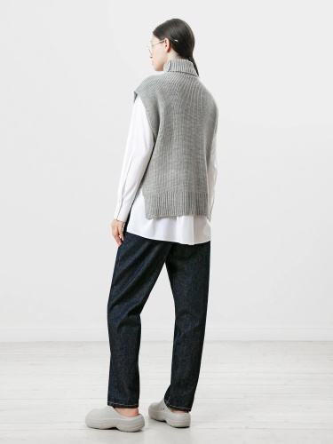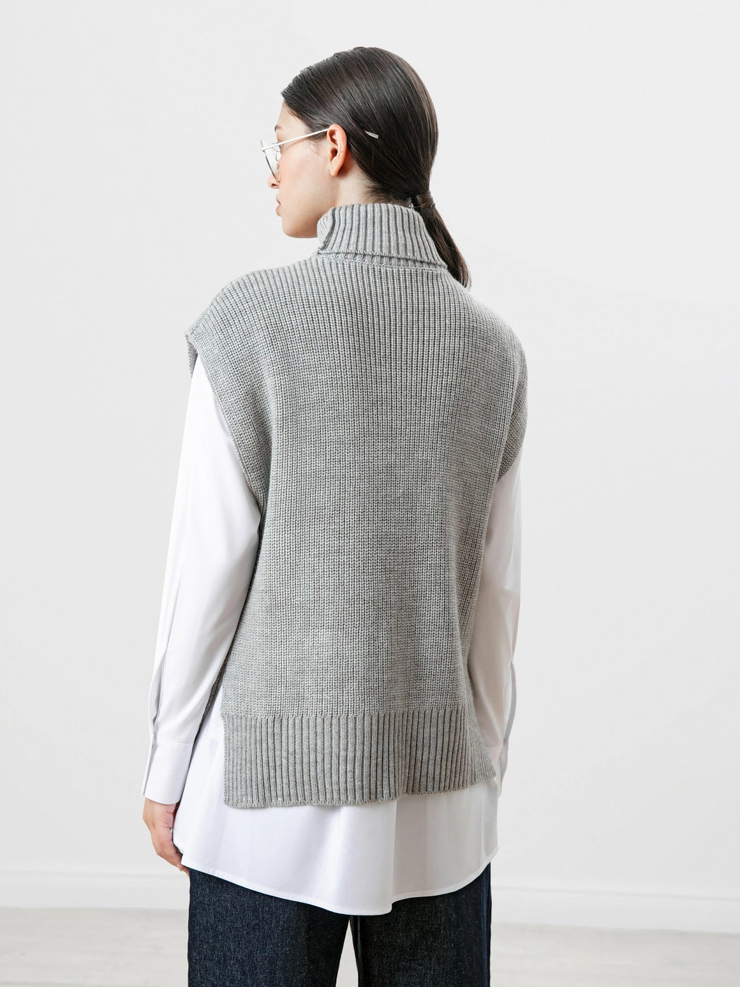 На сайте указаны российские размеры. Уютный жилет из фактурного вязаного трикотажа прямого свободного силуэта с широким воротником-стойка, резинкой и разрезами по низу. Прекрасная вещь для второго слоя при создании утепленных осенних образов. Рост модели на фото - 175 см.