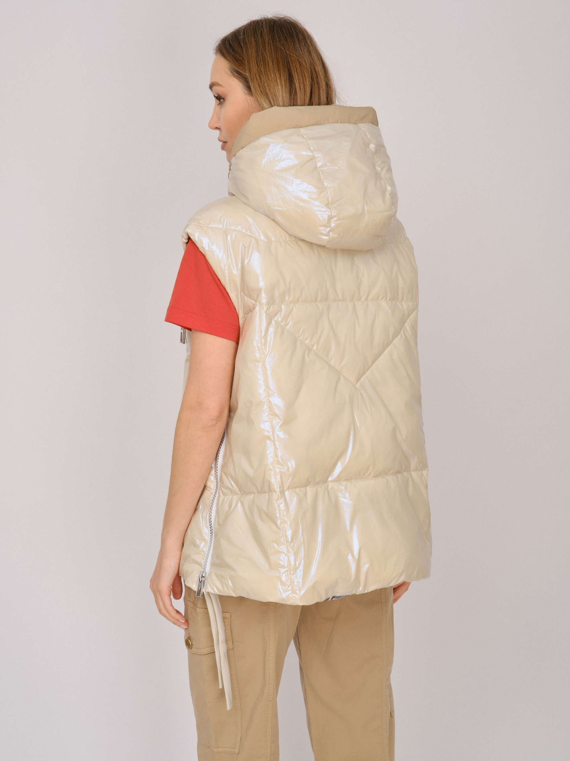 На сайте указаны российские размеры. Свободный светло-бежевый жилет на молнии, с капюшоном на завязках, с прорезными карманами и прорезными карманми на молнии, с боковыми разрезами на молнии и кулиской понизу. Длина по спинке: 68 см. Рост модели: 175 см.