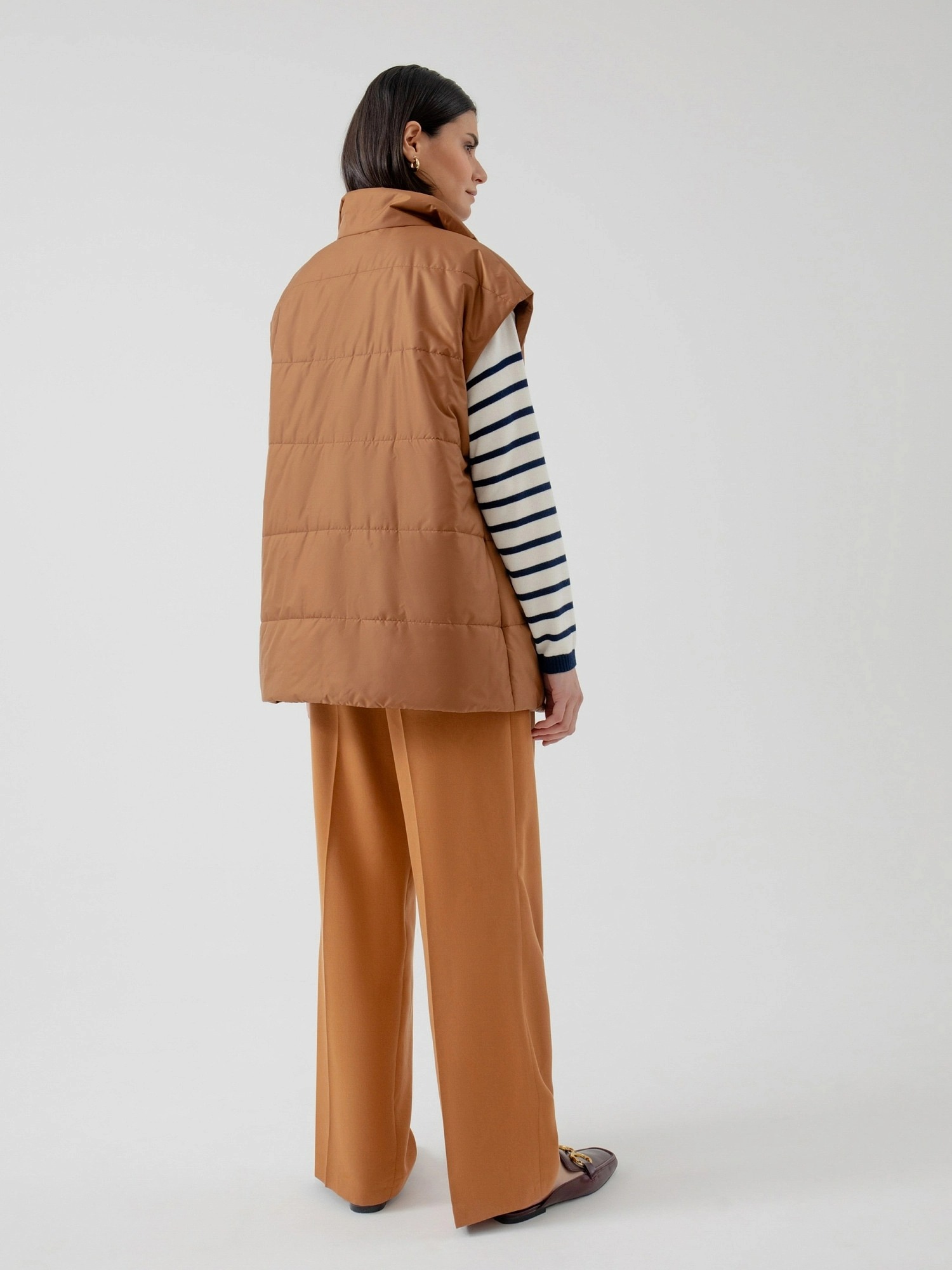 На сайте указаны российские размеры. Стеганый жилет в роскошном медовом цвете из плотной и мягкой плащевой ткани. Жилет выполнен на утеплителе, что сделает Ваш образ не только стильным, но и очень теплым. Воротник-стойка имеет комфортную посадку, которая не стеснит движений и при этом будет надежно защищать от ветра. В качестве дополнительного декоративного элемента в комплекте идет пояс, который сделает силуэт более женственным и утонченным. Для дополнительной защиты от ветра жилет выполнен с использованием мембраны RaftPro. Длина изделия 73 см. Рост модели 175 см.