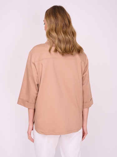 На сайте указаны российские размеры. Бежевый жакет трапеция на пуговицах, с отложным воротником, с накладными карманами, с рукавом 7/8, со стразами, с боковыми разрезами. Длина по спинке: 67 см. Рост модели: 175 см.