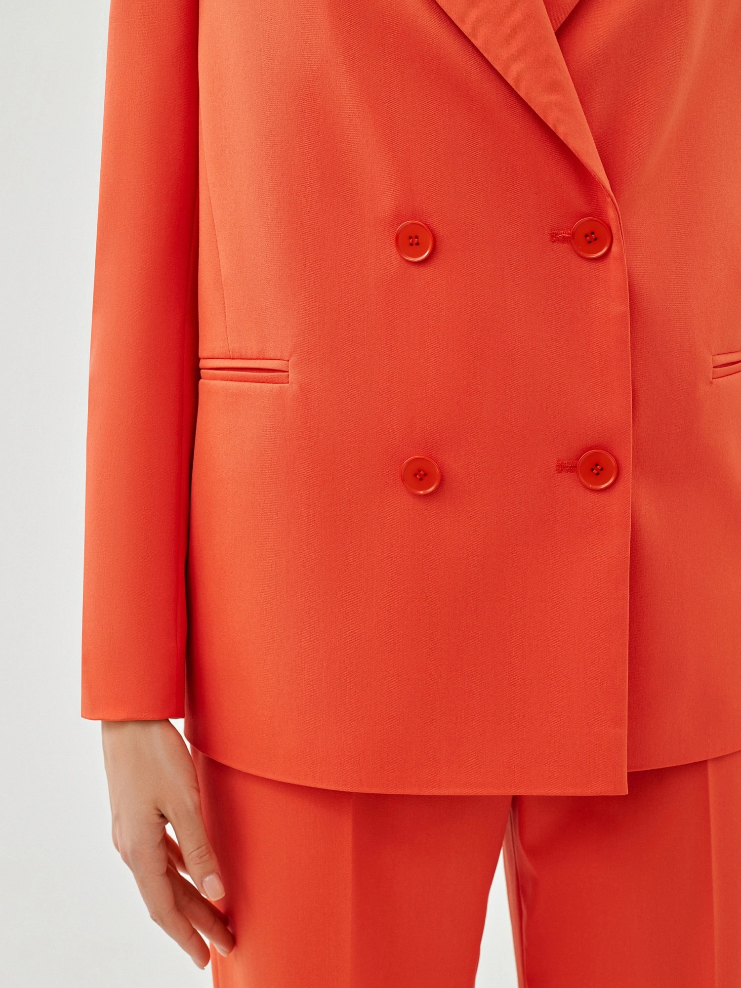 На сайте указаны российские размеры. Свободный удлинённый двубортный жакет из костюмной ткани в ярком цвете "грейпфрут". С прорезными карманами листочками и пуговицами в цвет ткани. Жакет полностью на подкладке. Такой жакет составит яркий ансамбль с брюками из одной ткани, а так же будет ярким акцентом в повседневном образе с джинсами. Рост модели 175 см.