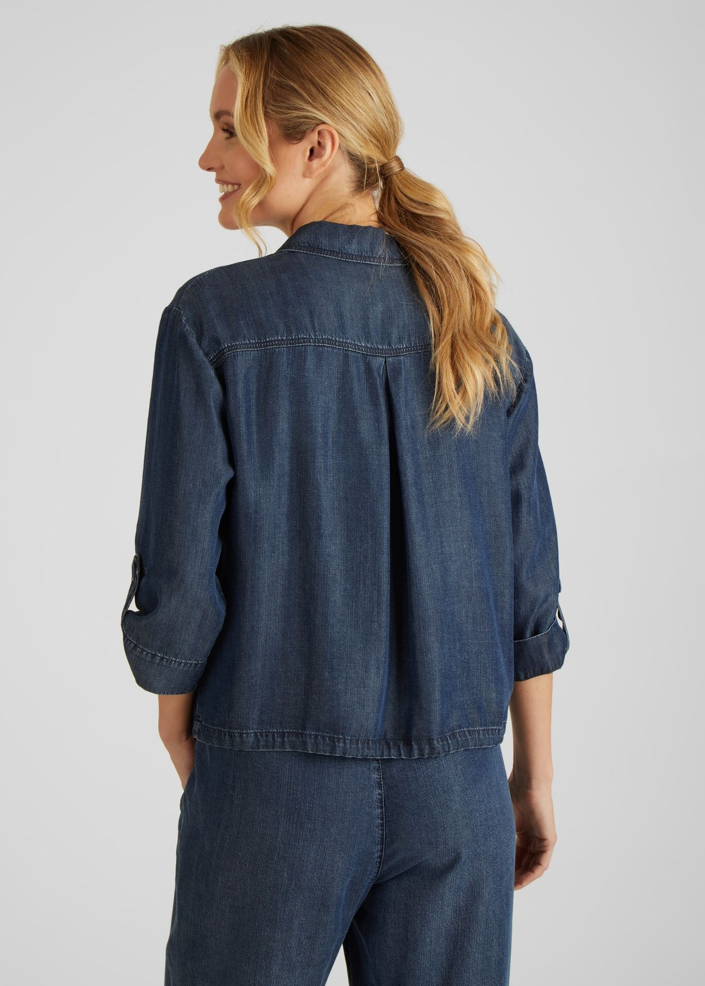 Модная куртка на пуговицах с рукавами 3/4 в джинсовом стиле и рубашечным воротником - абсолютный must-have для каждой женщины, следящей за трендами! Широкая форма обеспечивает удобную посадку, а кулиска на кромке позволяет регулировать куртку индивидуально. Куртка имеет практичные боковые карманы и стильные нагрудные карманы.
