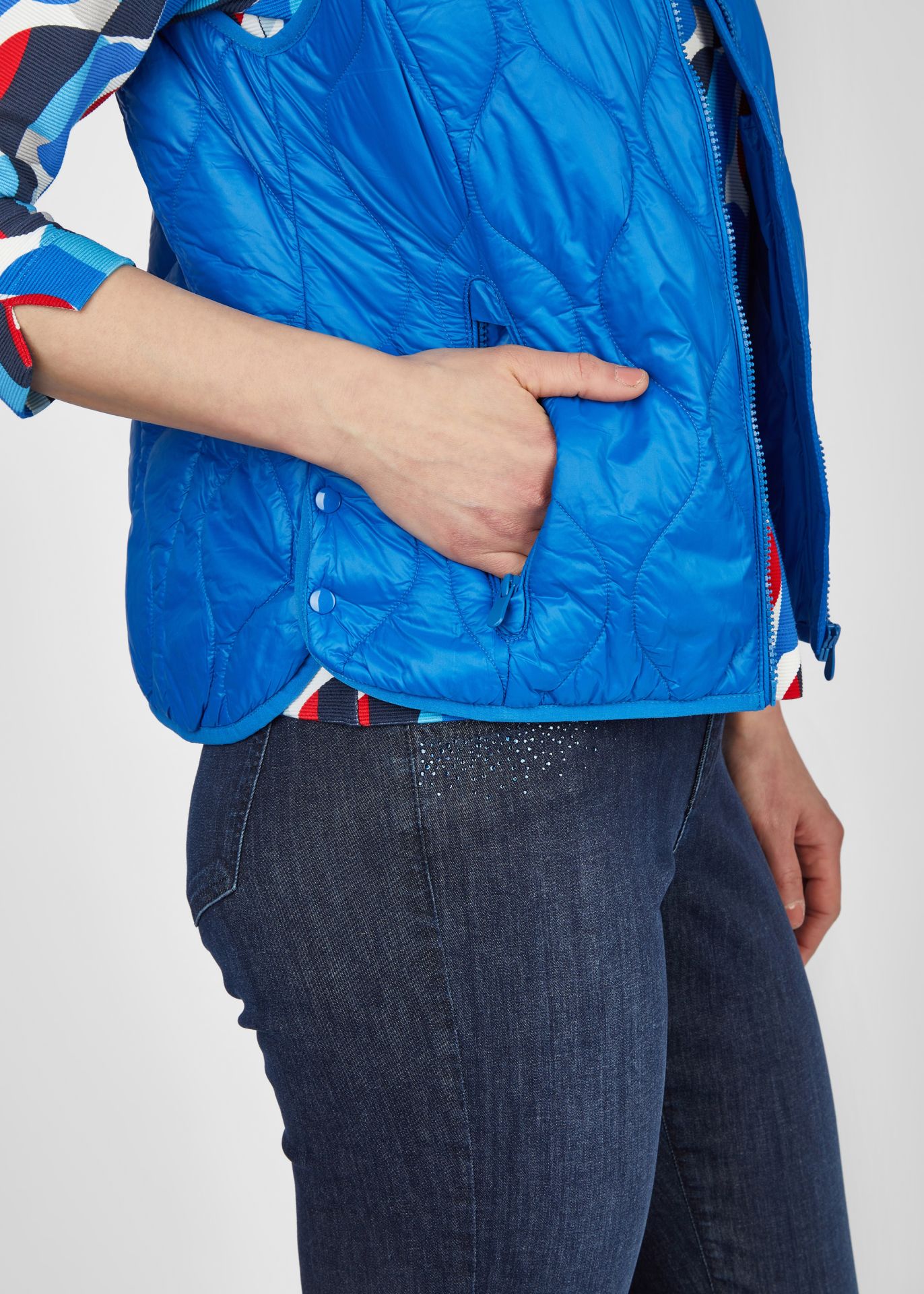 Жилет впечатляет простым однотонным дизайном и современным воротником-стойкой, который защитит от ветра и холода. Практичная молния позволяет легко надевать и снимать сумку, а карманы на молнии сохранят ваши ценные вещи в безопасности. Легкий и дышащий материал обеспечивает оптимальный комфорт в любой ситуации. Этот стеганый жилет можно носить как дополнительный слой под курткой или отдельно поверх блузки. Длина спинки от плеча для 44 размера: 64см.