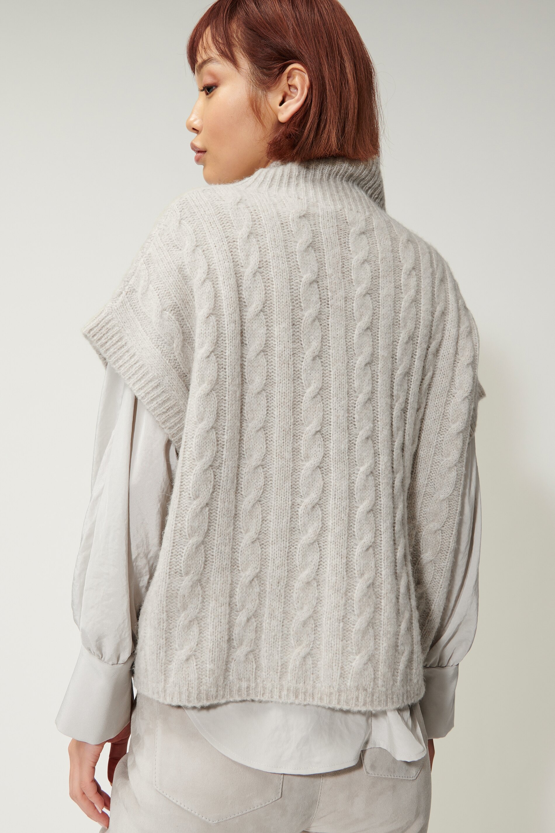 Легкий пуловер косой вязкой из высококачественной итальянской смесовой шерсти с эффектом меланжа. Объемный пуловер-кейп с ребристым воротником-водолазкой.