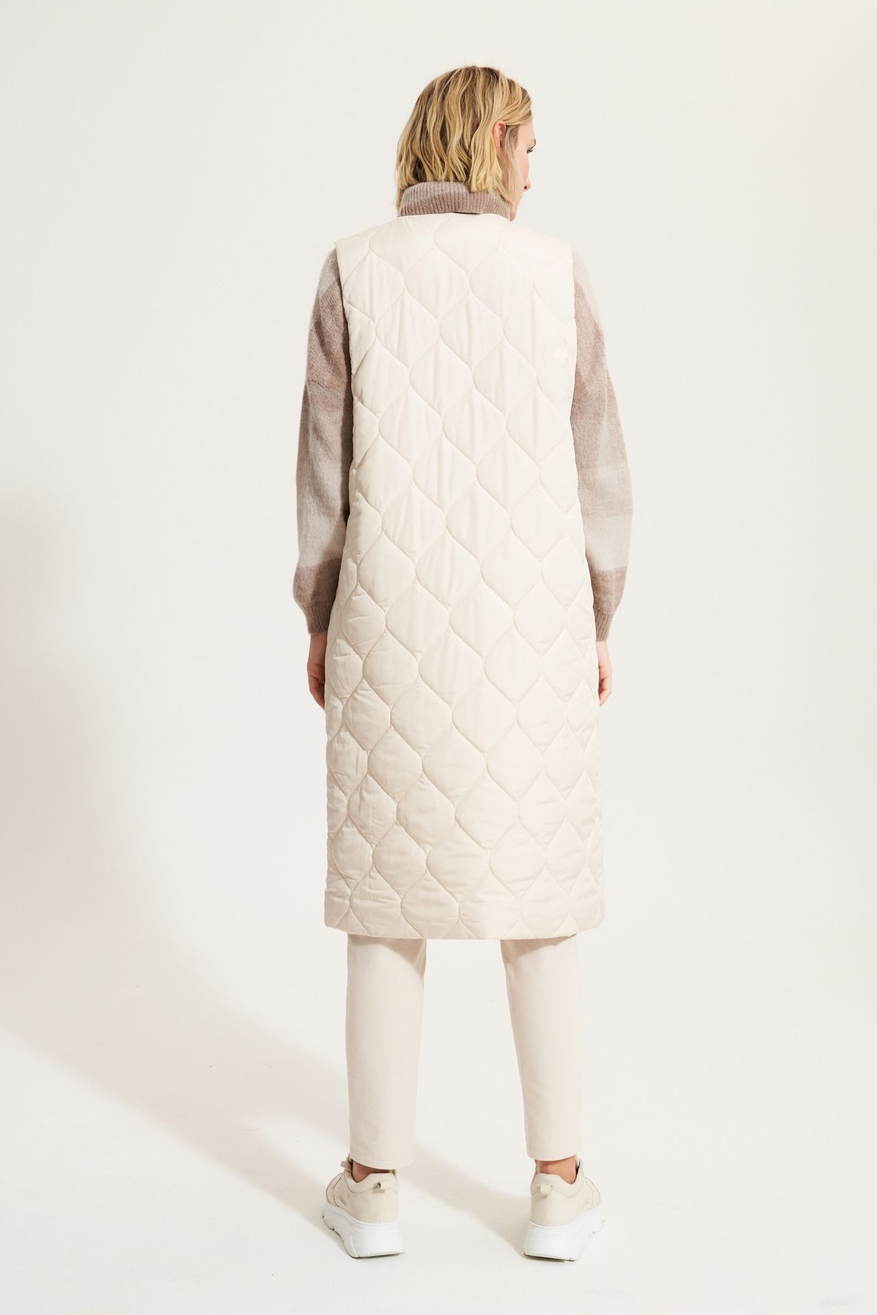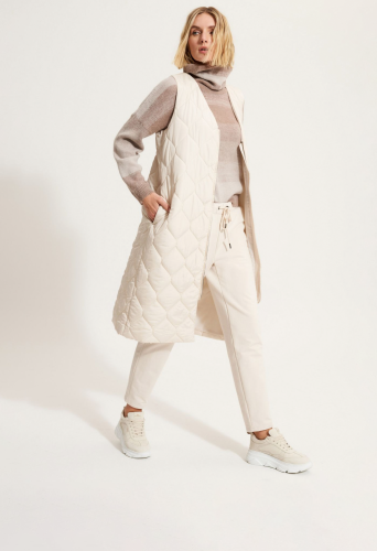 Длинный стеганый жилет из полиэсфира. V-образный вырез. Молния с логотипом со стеганой подкладкой. Карманы в боковых швах. Длина: 115 см.