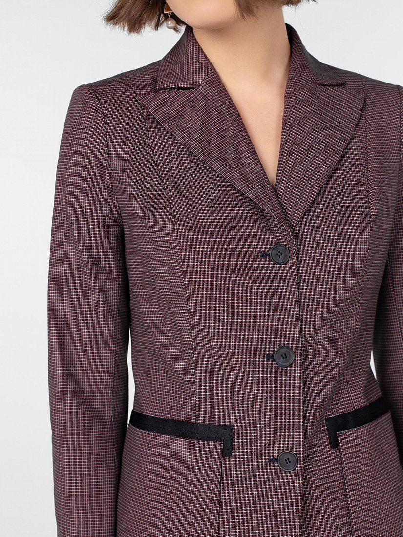 Классический жакет полуприлегающего силуэта на подкладке с втачным рукавом полной длины, классическим отложным воротником и прямоугольными накладными карманами. По верху карманов контрастная декоративная отделка. Застежка спереди на пуговицы.