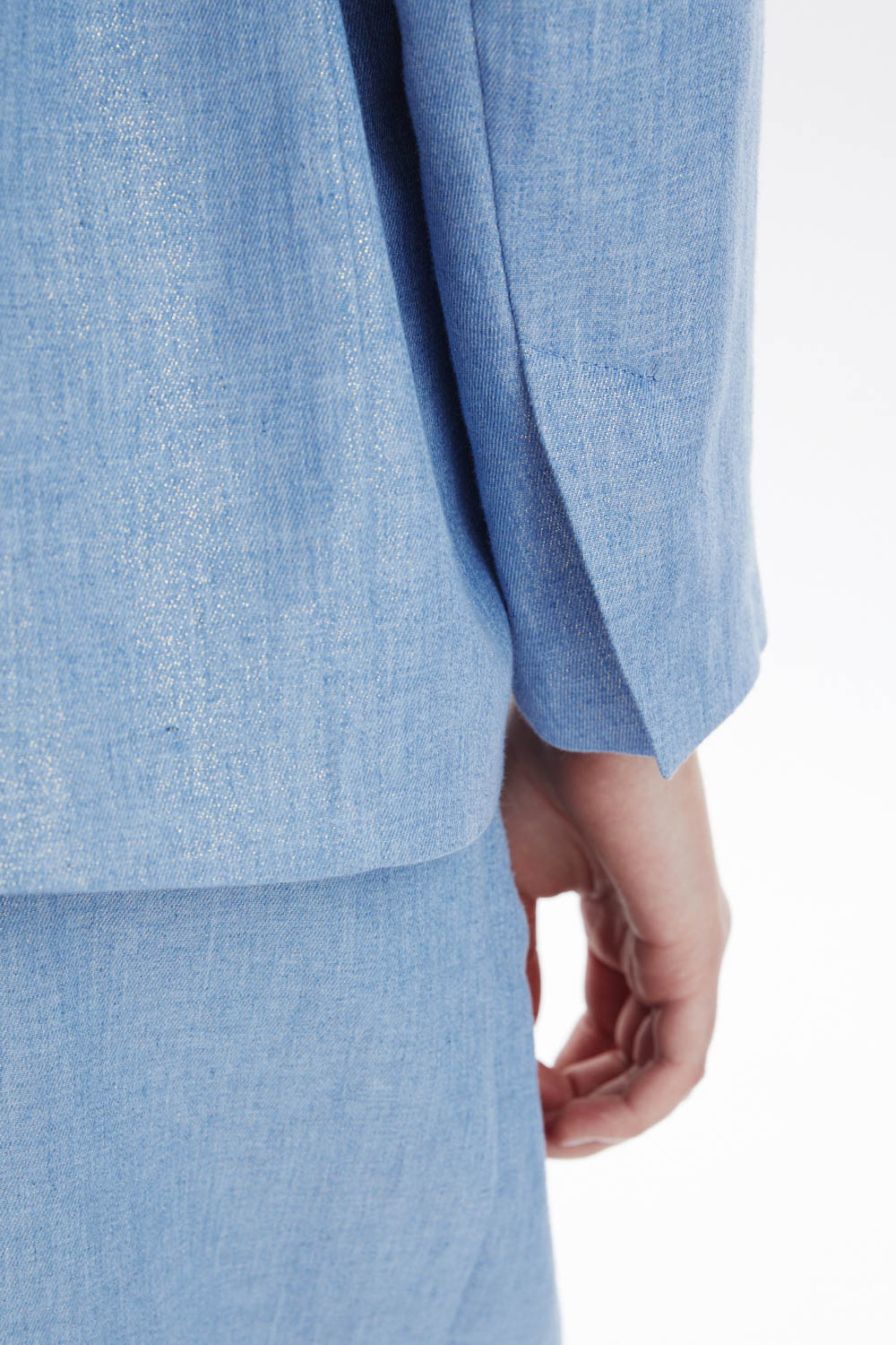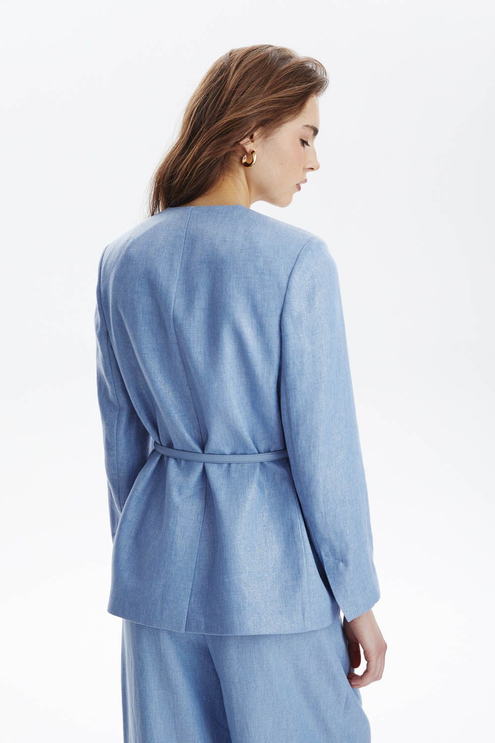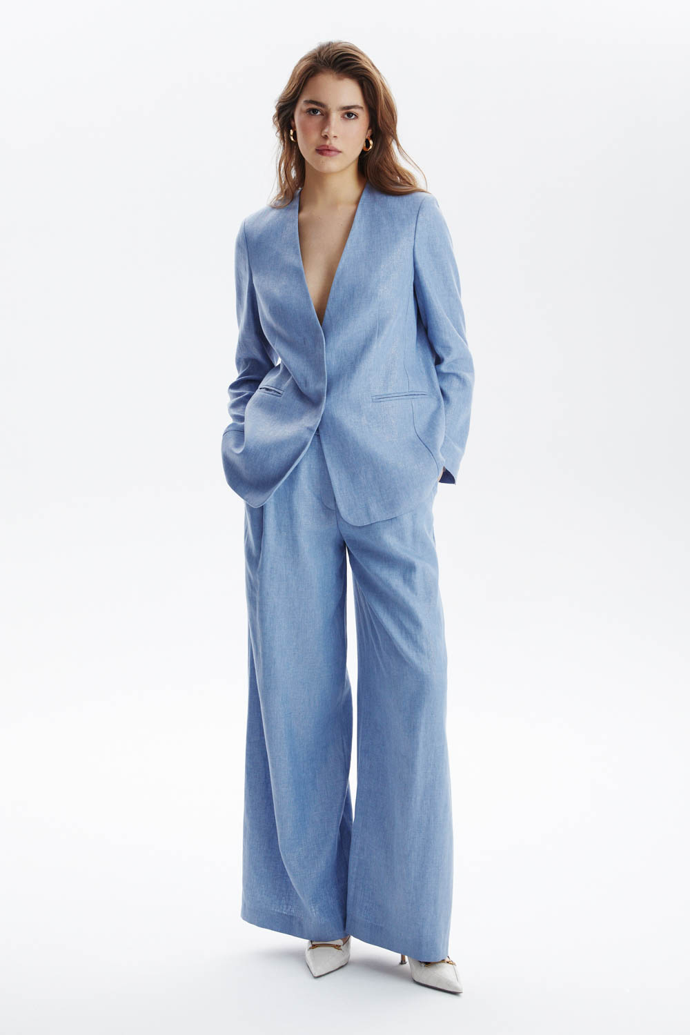 Жакет выполнен в изящном светло-голубом оттенке, который придает образу свежесть и лёгкость. Модель отличается лаконичным и современным кроем с глубоким V-образным вырезом, создающим элегантный и утончённый силуэт. Этот жакет станет прекрасным дополнением как к деловому, так и к повседневному стилю, подчеркивая индивидуальность и хороший вкус.