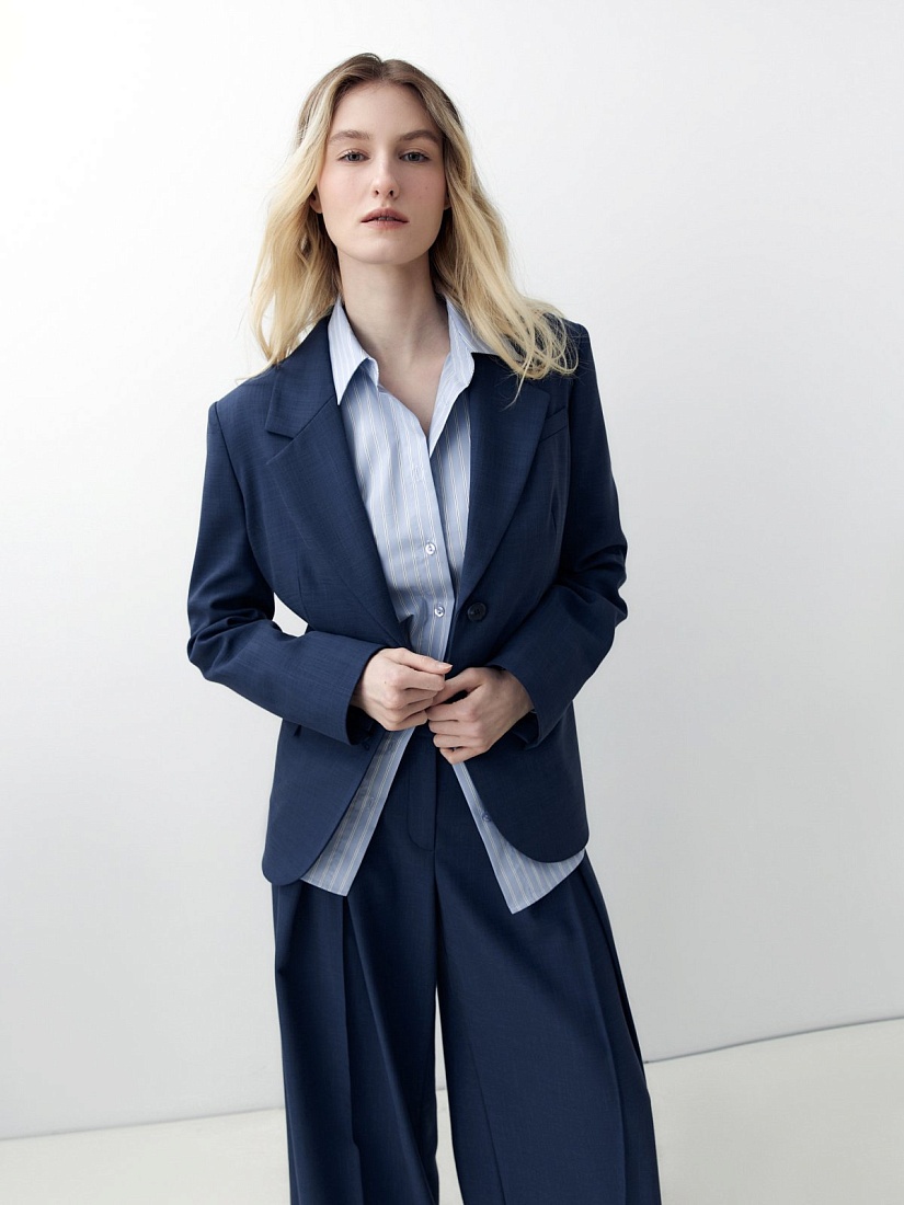 Удлиненный прямой однобортный жакет с V-образным вырезом и английским воротником. Жакет на двух пуговицах с прорезными карманами и клапанами, на спинке шлица.