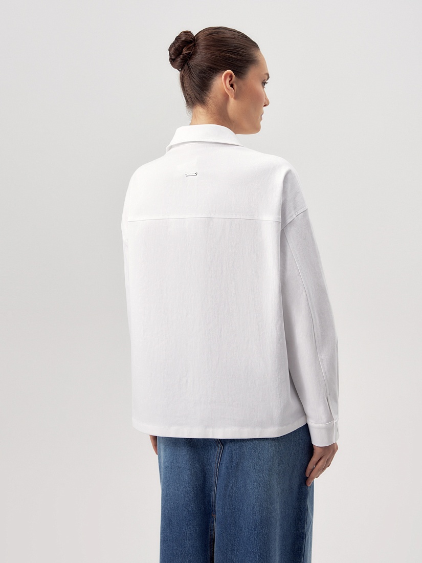 Жакет прямого силуэта с классическим отложным воротником, спущенным плечом и рукавом полной длины на манжете. Застежка спереди на кнопки в цвет ткани. Спереди рельефы и накладные карманы. Идеальный вариант для прохладной погоды. А белый цвет идеально сочетается с большим количеством повседневной одежды разных стилей.
