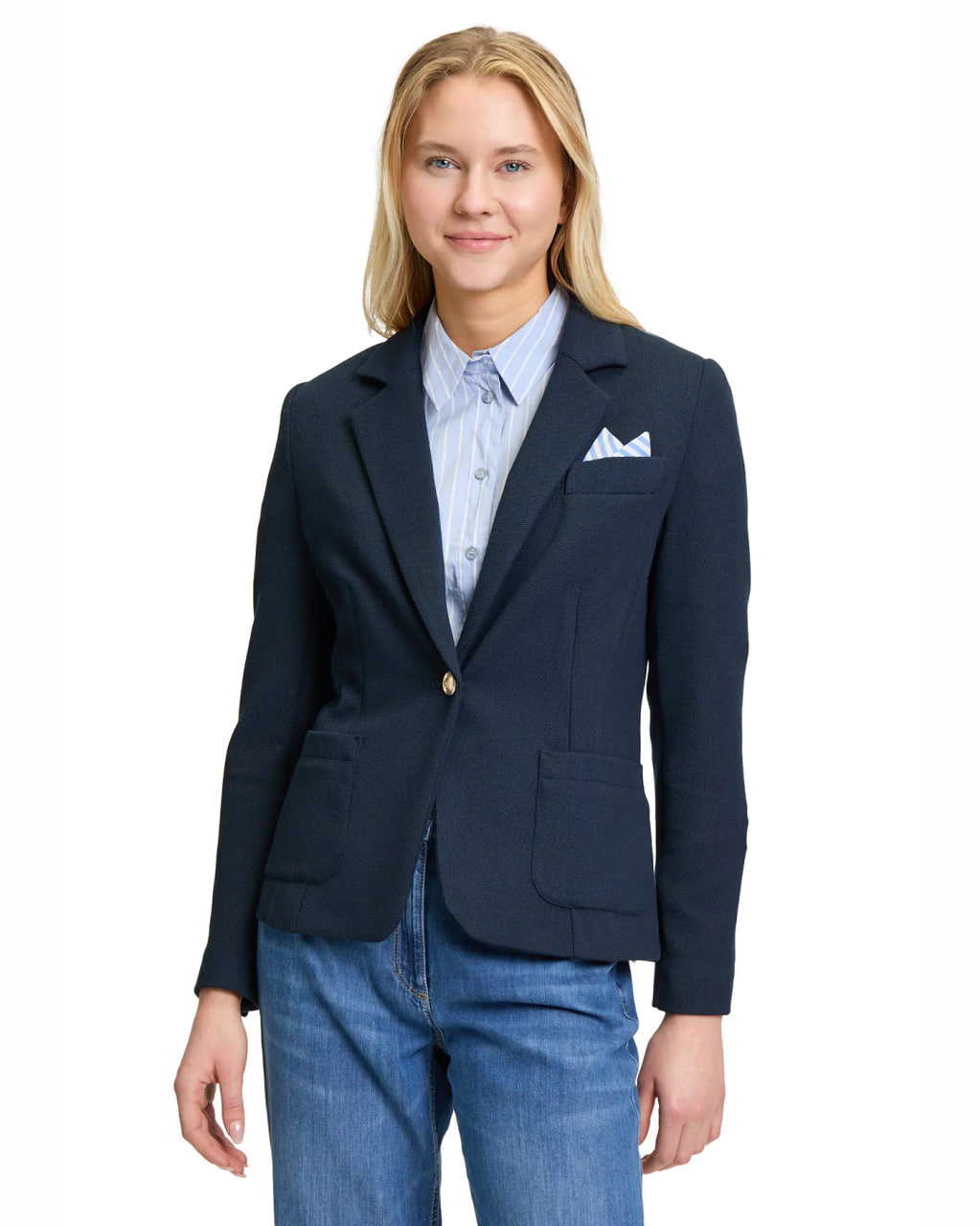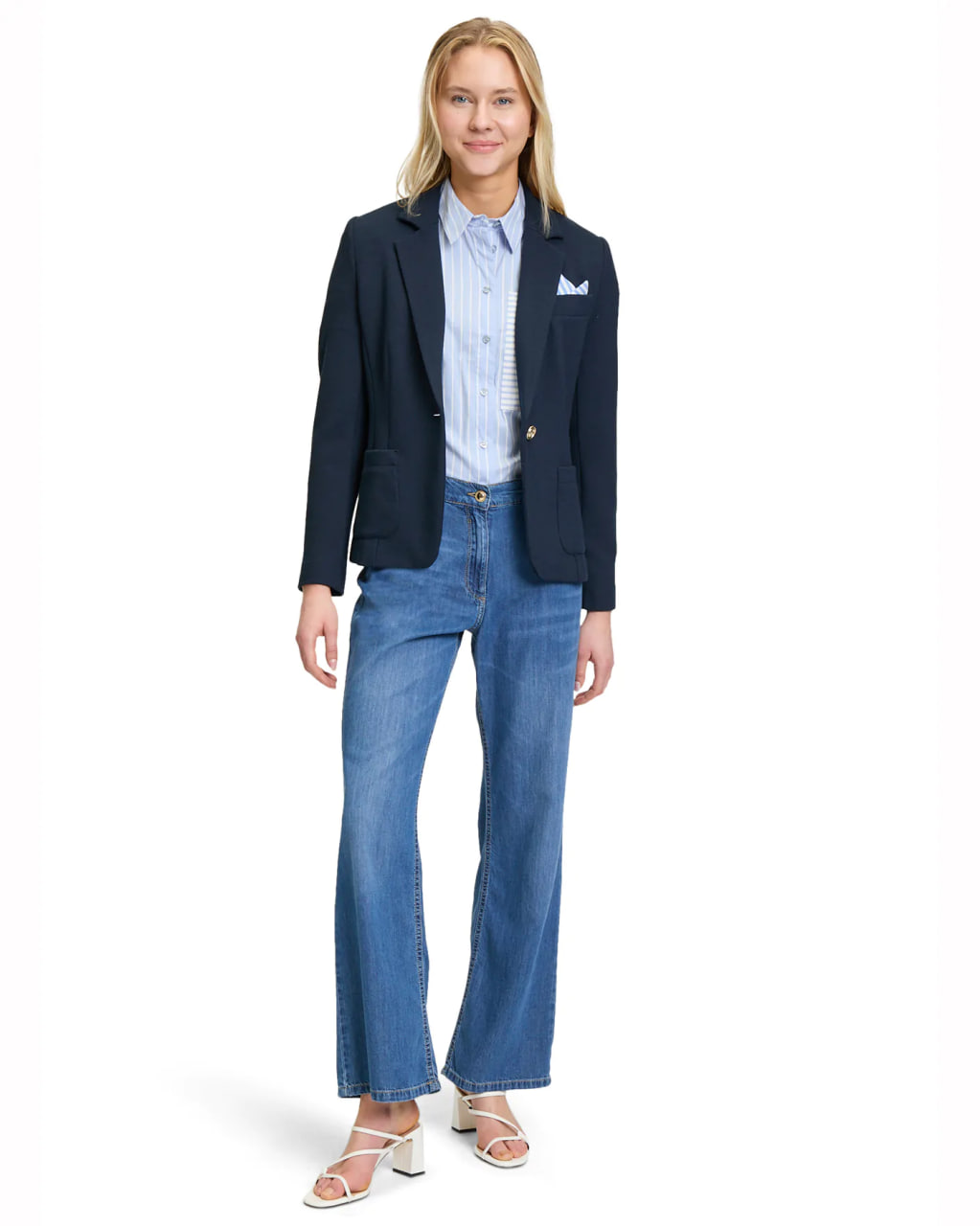 Приталенный блейзер Betty Barclay темно-синего цвета в строчный рисунок. Модель с лацканами, застежка на одну пуговицу, накладные карманы по бокам. Блейзер - универсальная вещь вашего гардероба.